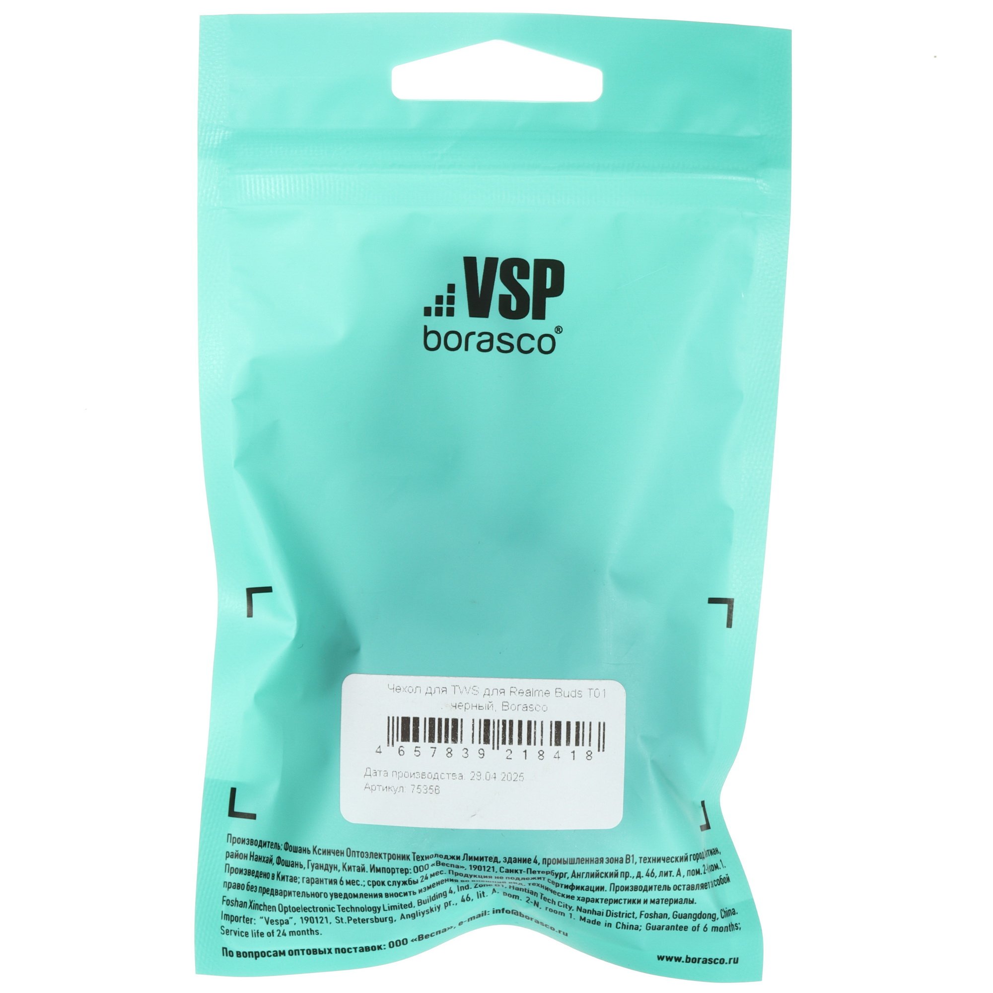 Черный чехол Borasco 75356 совместим с наушниками TWS Realme Buds T01. Аксессуар плотно облегает кейс и не дает ему выпадать. Чехол защищает станцию-футляр от царапин и прочих повреждений, не дает пыли и брызгам попадать внутрь.