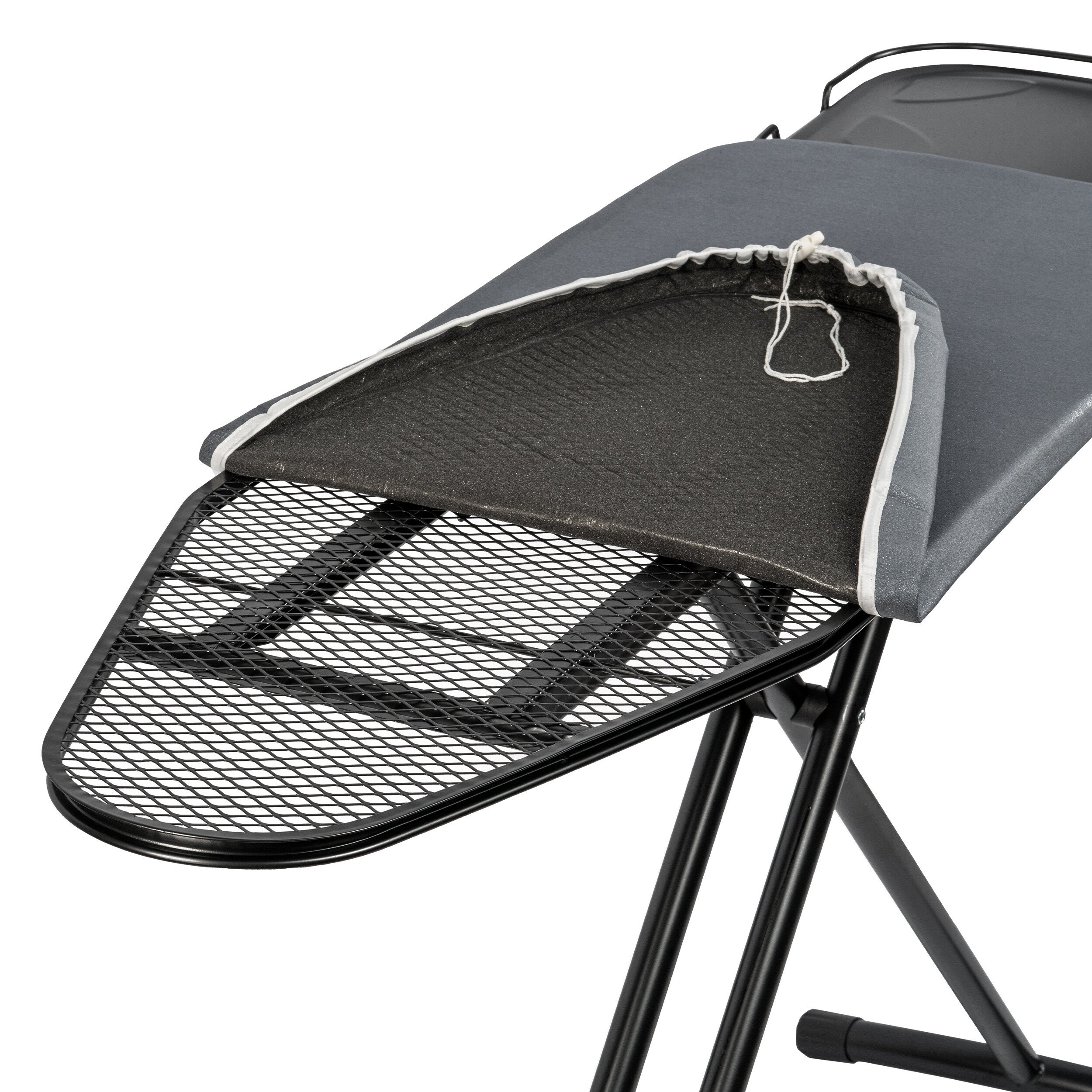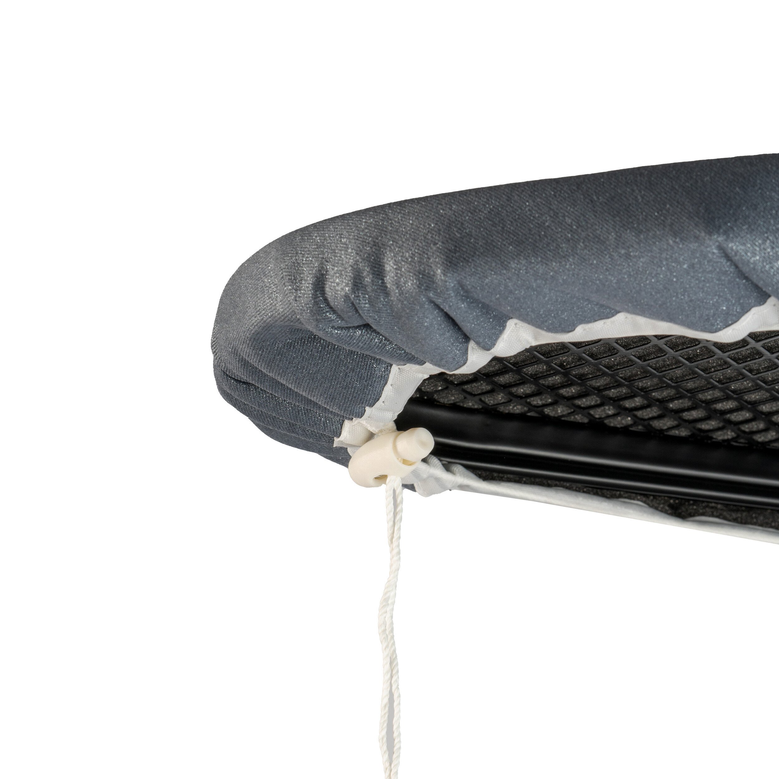 5-ти слойный чехол с антипригарным покрытием. Поверхность чехла защищена от высоких температур (до 210℃). Внутренний металлизированный слой отражает тепло и пар, что ускоряет и облегчает глажение. Подходит для использования утюга и парогенератора. Шнурок с кнопкой-стопором надежно удерживают чехол на доске.