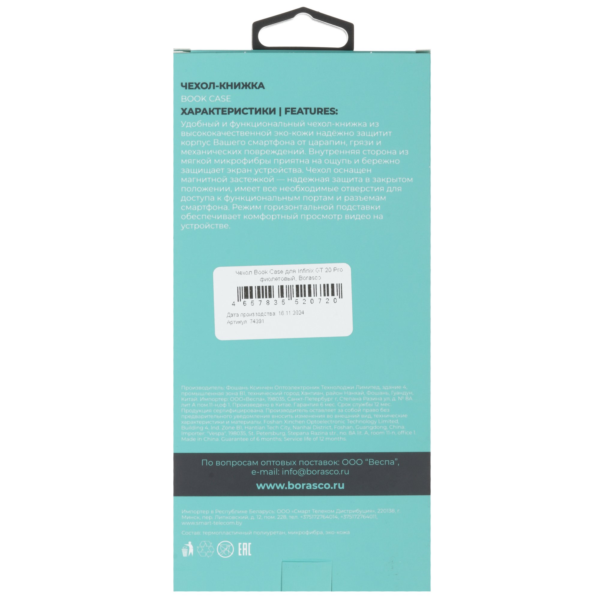 Чехол-книжка BoraSCO для Infinix GT 20 Pro из искусственной кожи защищает корпус и дисплей устройства от попадания пыли, брызг и загрязнений. В закрытом виде аксессуар оберегает экран от потертостей и царапин при ношении в кармане или сумке вместе с ключами и другими предметами. Чехол смягчает удары и уменьшает риск появления сколов и прочих поломок.