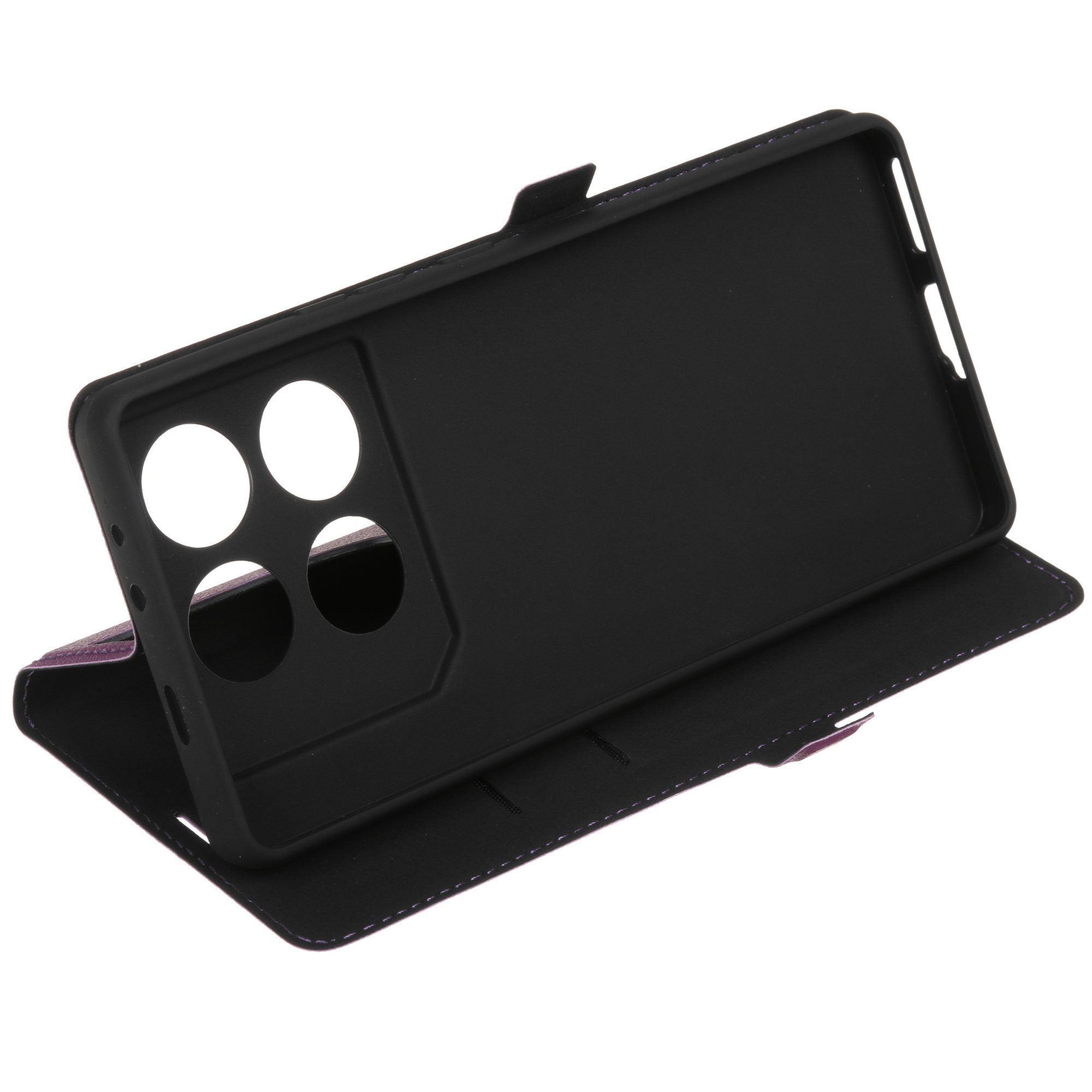 BoraSCO с однотонным фиолетовым дизайном подходит для Infinix GT 20 Pro. В чехле есть отверстия для свободного доступа к основной камере и разъемам. Подставка делает удобным просмотр видео и игр при горизонтальной ориентации экрана. Модель дополнена карманом для банковских карт.