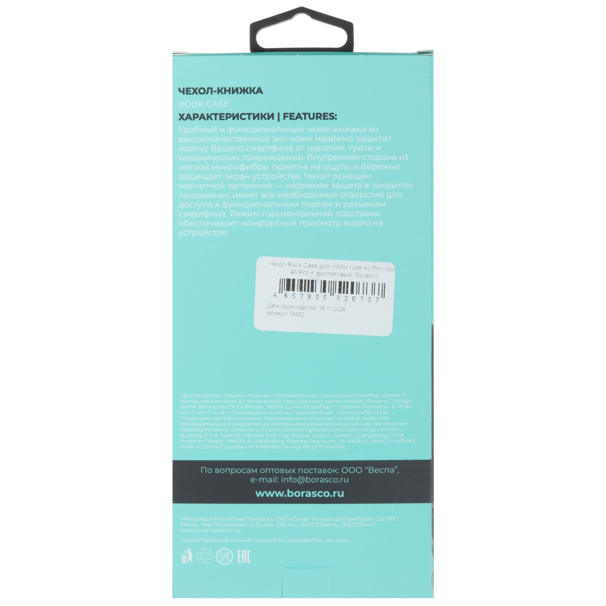 Чехол-книжка BoraSCO для Infinix NOTE 40 Pro 5G/ 40 Pro+ 5G из искусственной кожи защищает корпус и дисплей устройства от попадания пыли, брызг и загрязнений. В закрытом виде аксессуар оберегает экран от потертостей и царапин при ношении в кармане или сумке вместе с ключами и другими предметами. Чехол смягчает удары и уменьшает риск появления сколов и прочих поломок.