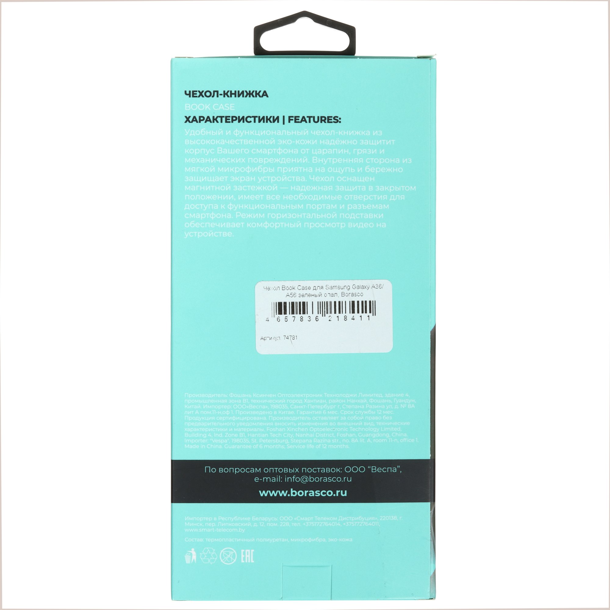 Чехол-книжка BoraSCO Book Case для Samsung Galaxy A36/A56 с диагональю 6.7 дюйма представлен в зеленом цвете. Аксессуар из полиуретана и экокожи защищает смартфон от механических воздействий, потертостей и загрязнений со всех сторон. Мягкая подкладка из микрофибры уберегает экран от царапин и сколов. В конструкции чехла есть отверстия под объективы камеры, микрофон, динамик и разъемы.