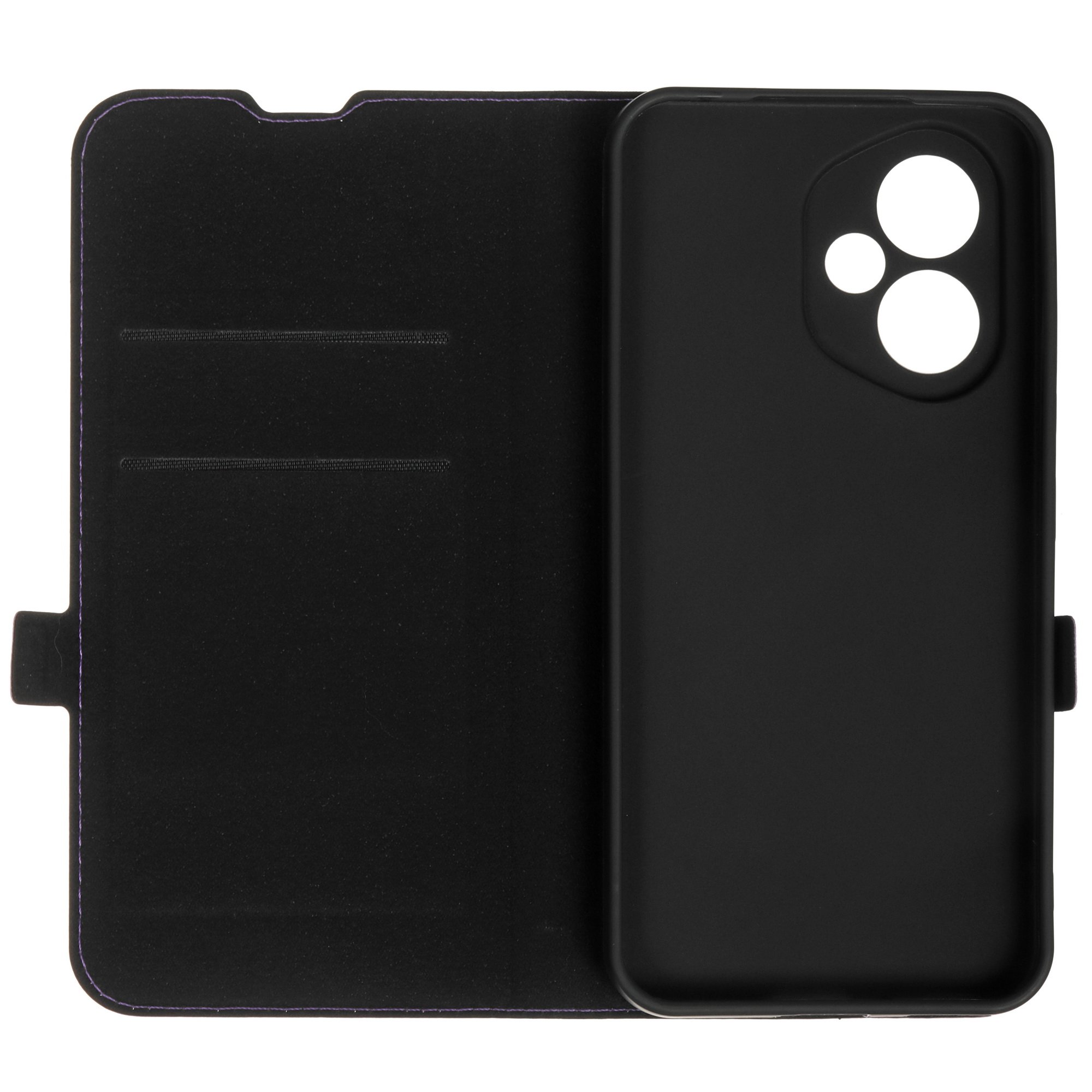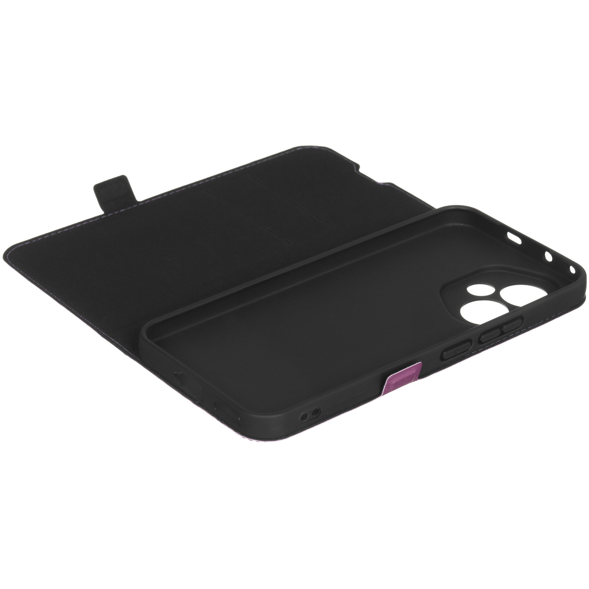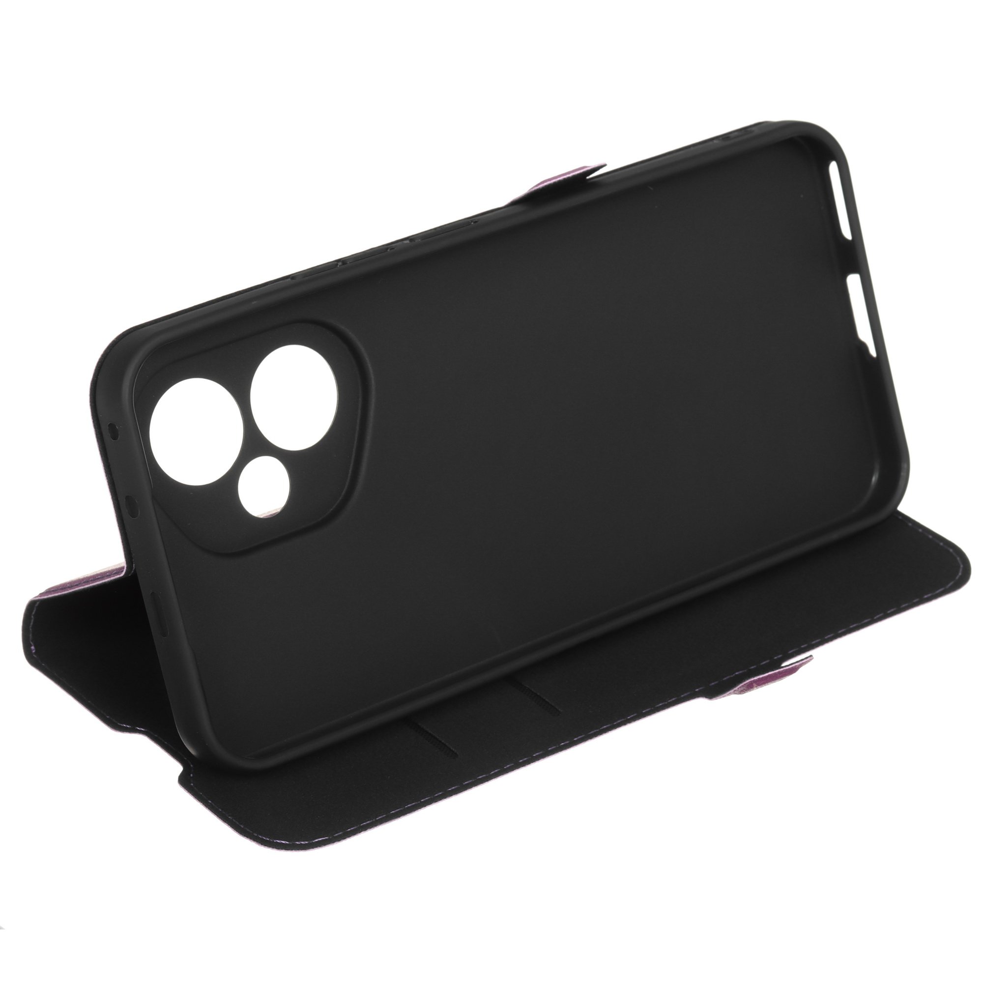 Чехол BoraSCO фиолетового цвета оснащен вырезами в соответствии с особенностями смартфона. Для комфортного просмотра мультимедиа конструкция крышки предусматривает трансформацию в подставку. Внутри есть карманы для пластиковых карт. Благодаря застежке на магните чехол удерживается в закрытом положении.