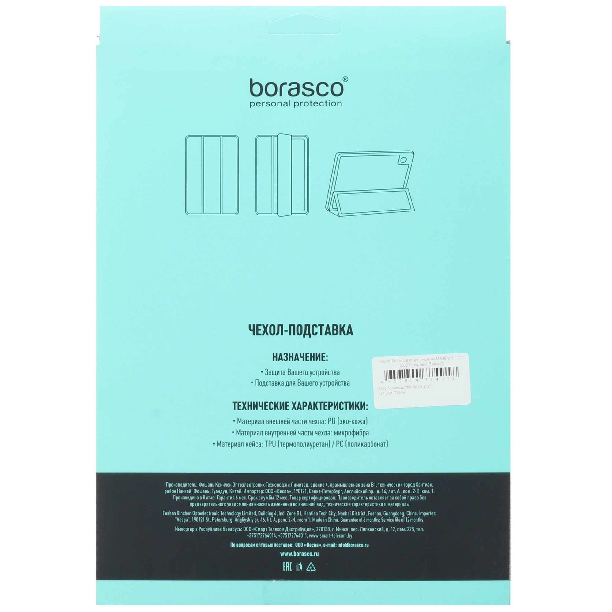Чехол-книжка BoraSCO для HUAWEI MatePad/ MatePad 11.5/ MatePad Air обеспечивает защиту экрана, корпуса и боковых граней планшетного компьютера с диагональю 11.5 дюйма. Прочный каркас из поликарбоната гарантирует плотную фиксацию устройства и оснащен необходимыми вырезами для свободного доступа к функциональным разъемам. Обложка из термопластичного полиуретана и искусственной кожи черного цвета уберегает от неблагоприятных воздействий. Гибкая конструкция передней крышки предусматривает фиксацию чехла-книжки BoraSCO в режиме подставки, что гарантирует комфорт при просмотре мультимедийного контента.