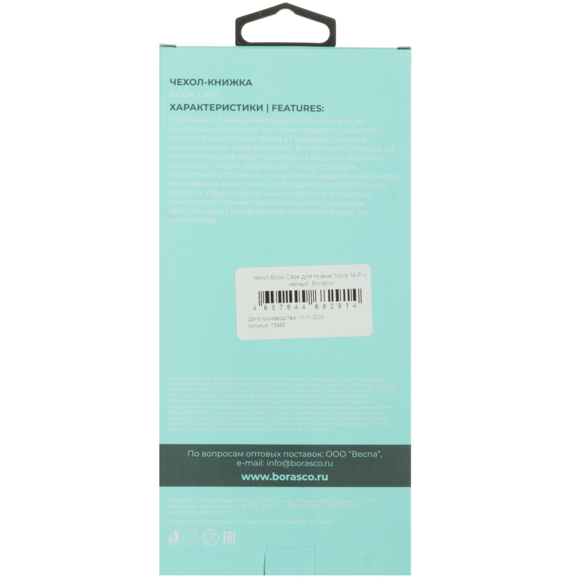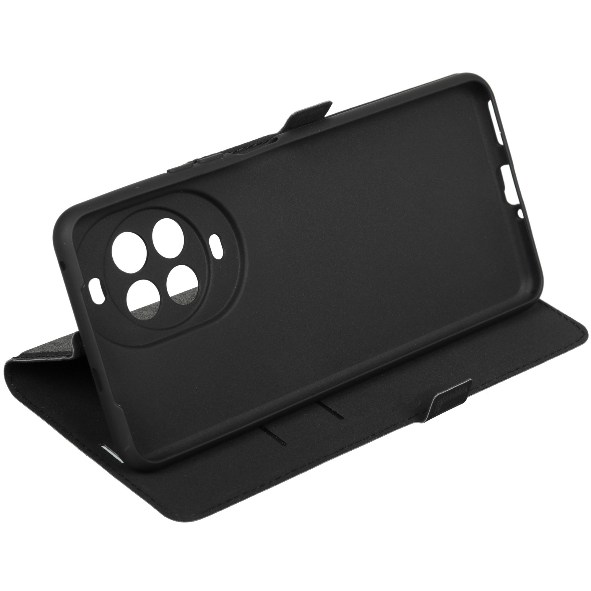 Черный чехол-книжка BoraSCO для HUAWEI nova 14 Pro выполнен из устойчивой к износу и простой в уходе искусственной кожи. Изделие закрывает устройство со всех сторон вместе с углами и боковыми гранями. При этом сохранен доступ к основной камере и разъемам.