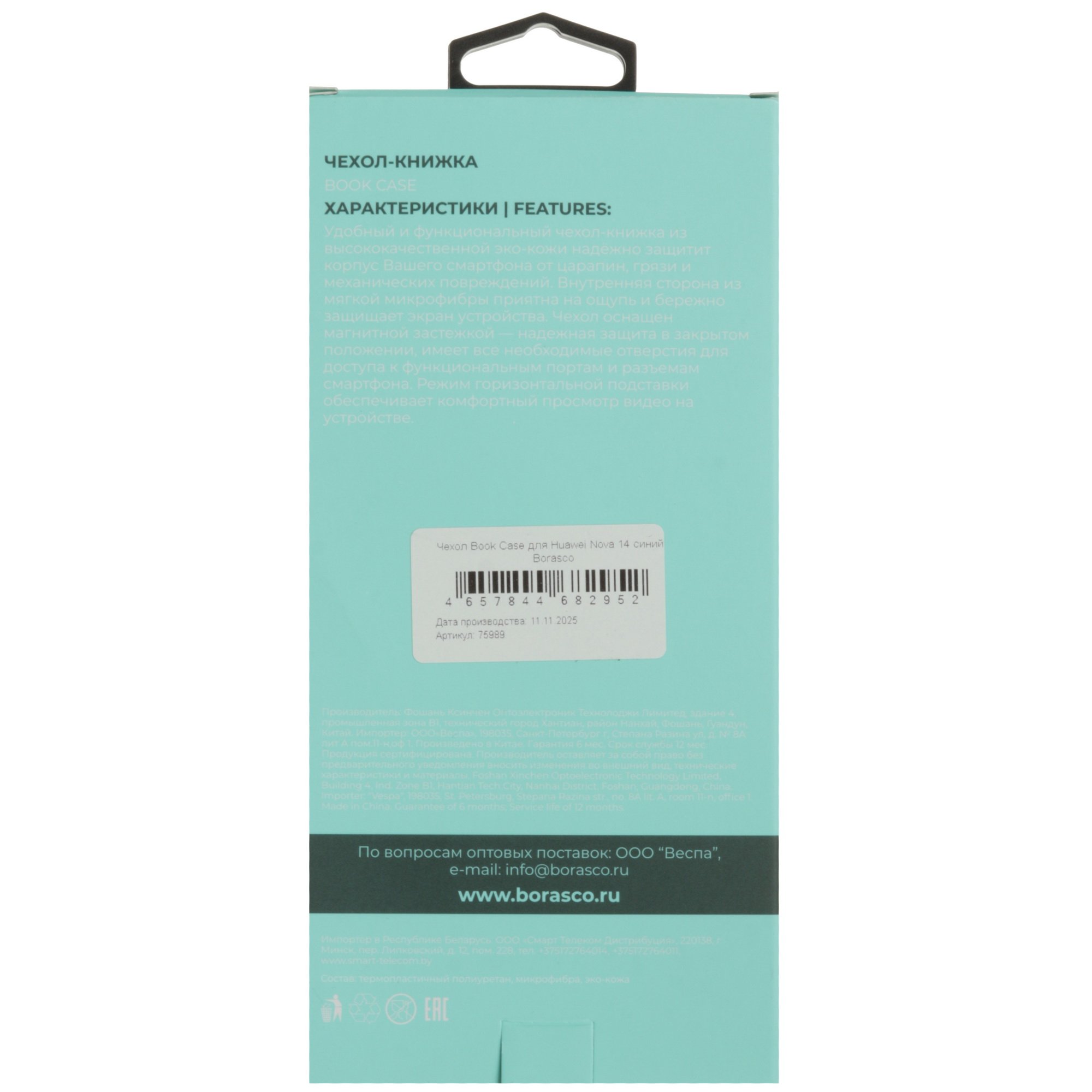 Синий чехол-книжка BoraSCO для HUAWEI nova 14 выполнен из устойчивой к износу и простой в уходе искусственной кожи. Изделие закрывает устройство со всех сторон вместе с углами и боковыми гранями. При этом сохранен доступ к основной камере и разъемам.