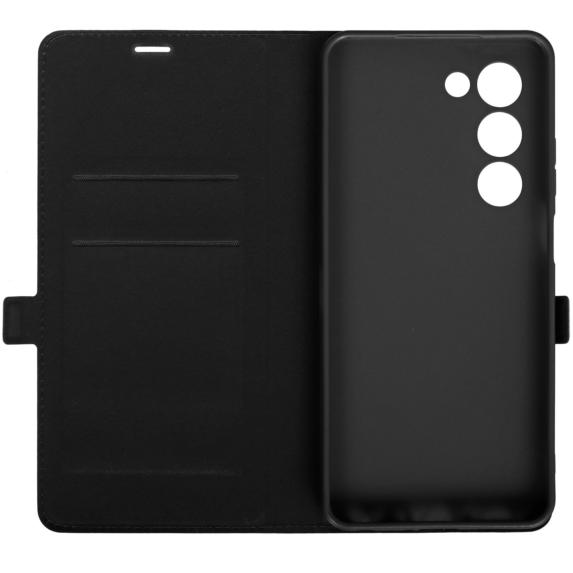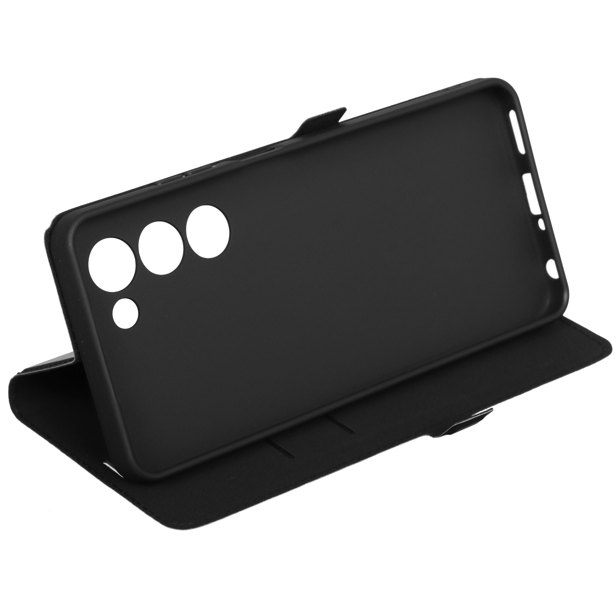 Чехол-книжка BoraSCO черного цвета оснащен вырезами в соответствии с особенностями смартфона. Для комфортного просмотра мультимедиа конструкция крышки предусматривает трансформацию в подставку. Внутри есть карманы для пластиковых карт. Благодаря застежке на магните чехол удерживается в закрытом положении.