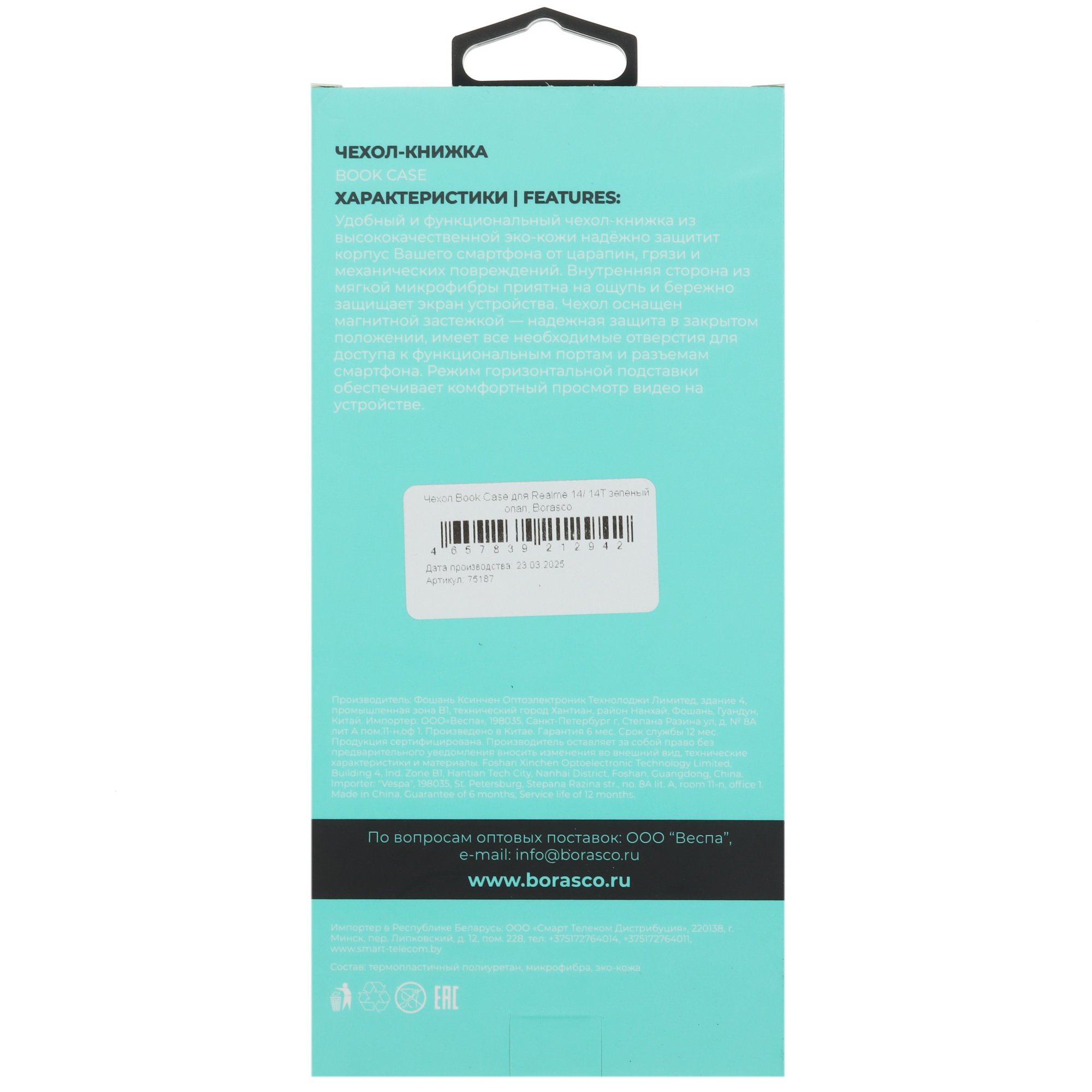 Зеленый чехол-книжка BoraSCO для realme 14/ 14T с магнитной застежкой защищает обе стороны смартфона от повреждений при несильных падениях и попадания на поверхность пыли или загрязнений. Чехол подходит для смартфонов моделей 14 и 14T от бренда realme.