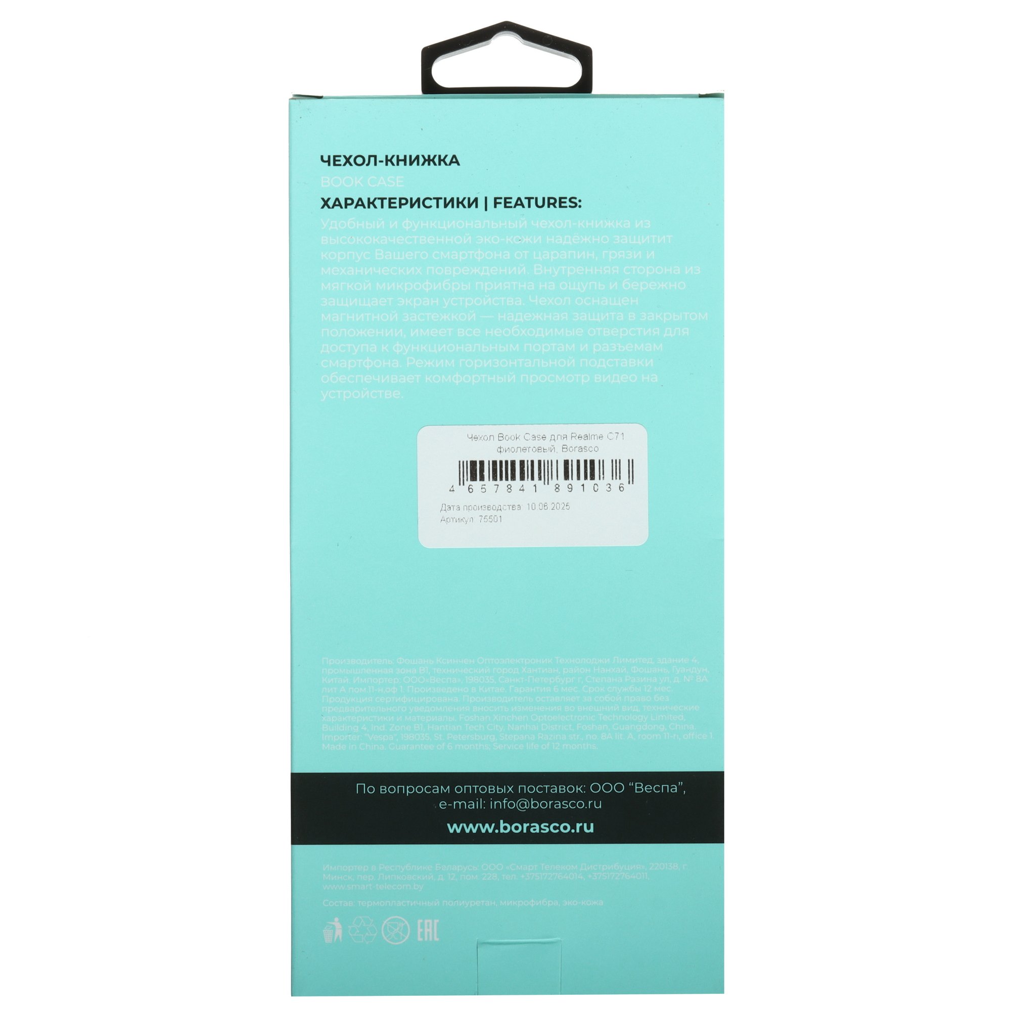 Фиолетовый чехол-книжка BoraSCO для realme C71 защищает обе стороны смартфона от повреждений при несильных падениях и попадания на поверхность пыли или загрязнений. Чехол подходит для смартфонов модели C71 от бренда realme.