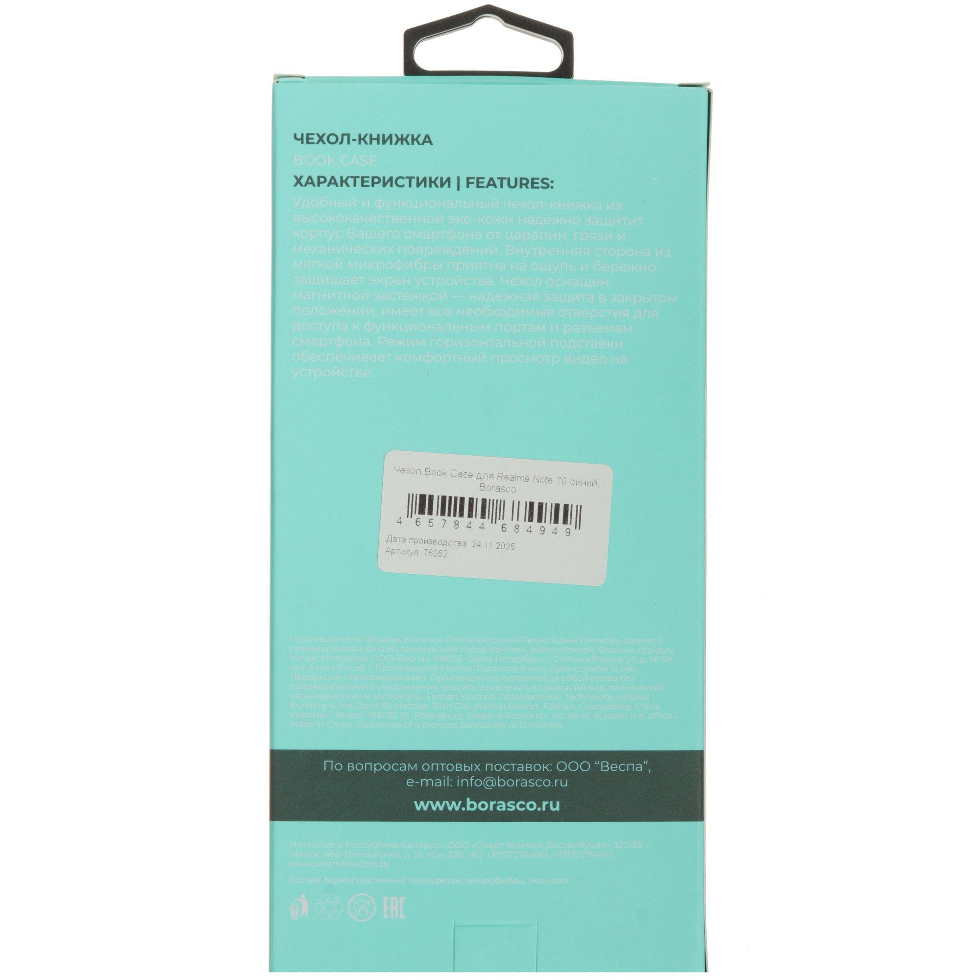 Чехол-книжка BoraSCO для realme Note 70 выполнен из простой в уходе и устойчивой к износу искусственной кожи. Аксессуар закрывает устройство со всех сторон вместе с углами, боковыми гранями и дисплеем. В закрытом виде чехол защищает экран от царапин и сколов при ношении в сумке вместе с ключами и другими вещами, случайном ударе.