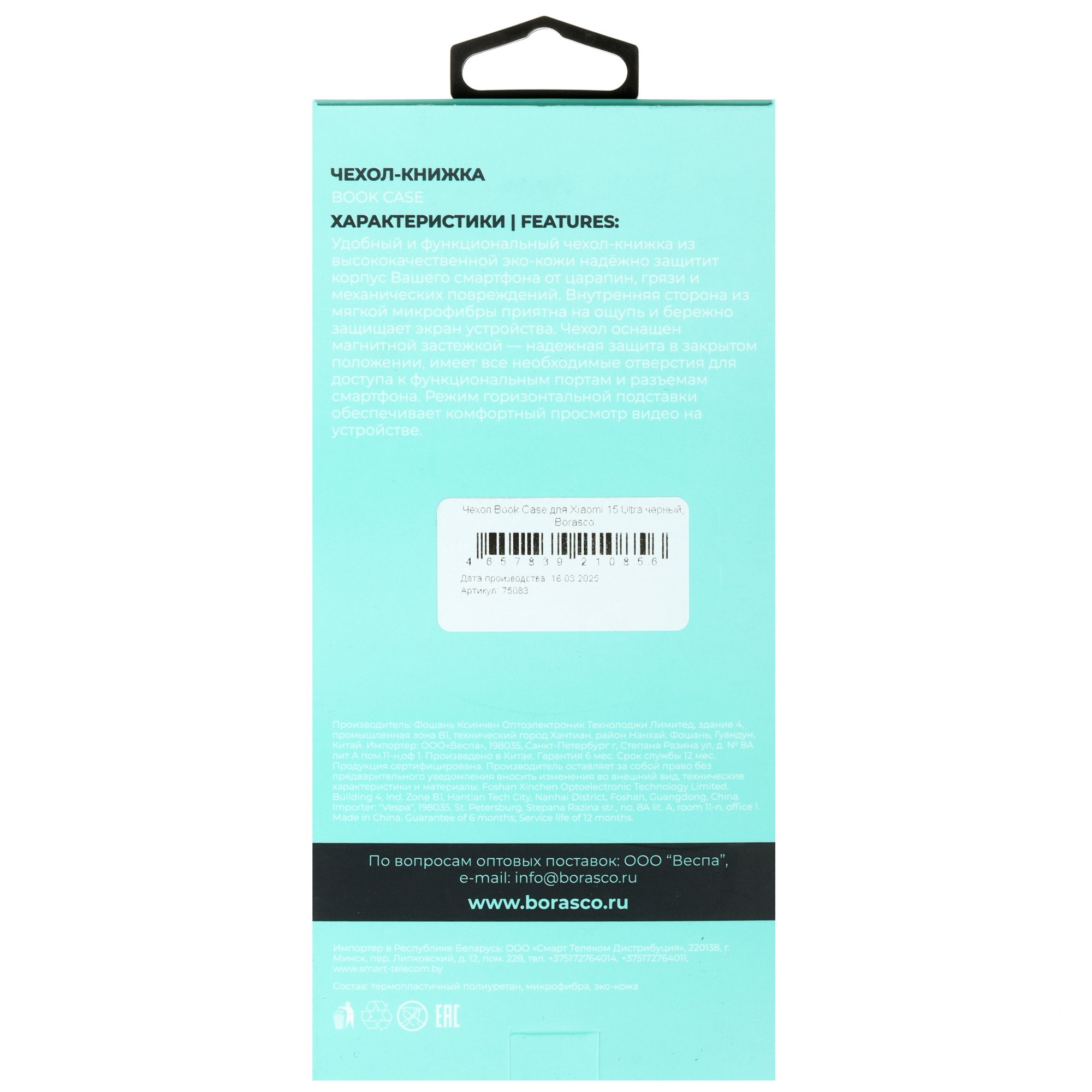 Чехол-книжка BoraSCO для Xiaomi 15 Ultra с диагональю 6.73 дюйма представлен в черном цвете. Аксессуар изготовлен из полиуретана с амортизационными свойствами и искусственной кожи. Чехол защищает смартфон от механических повреждений при ударах и падениях, потертостей и загрязнений со всех сторон. Мягкая подкладка из микрофибры уберегает экран от появления царапин и сколов. В конструкции чехла есть отверстия под объективы камеры, микрофон, динамик и разъемы.