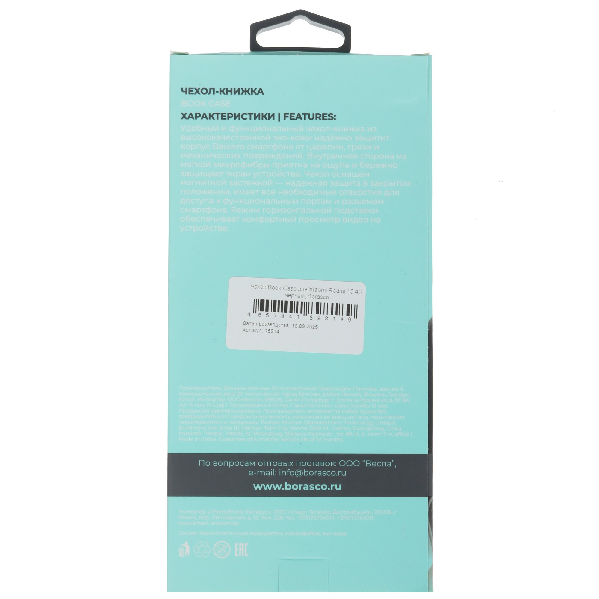 Черный чехол-книжка BoraSCO для Xiaomi REDMI 15 5G защищает устройство от случайных повреждений, попадания брызг и пыли. Аксессуар закрывает корпус вместе с боковыми гранями и углами, при этом оставляет доступ к разъемам и основной камере. В закрытом виде чехол-книжка не дает дисплею царапаться.
