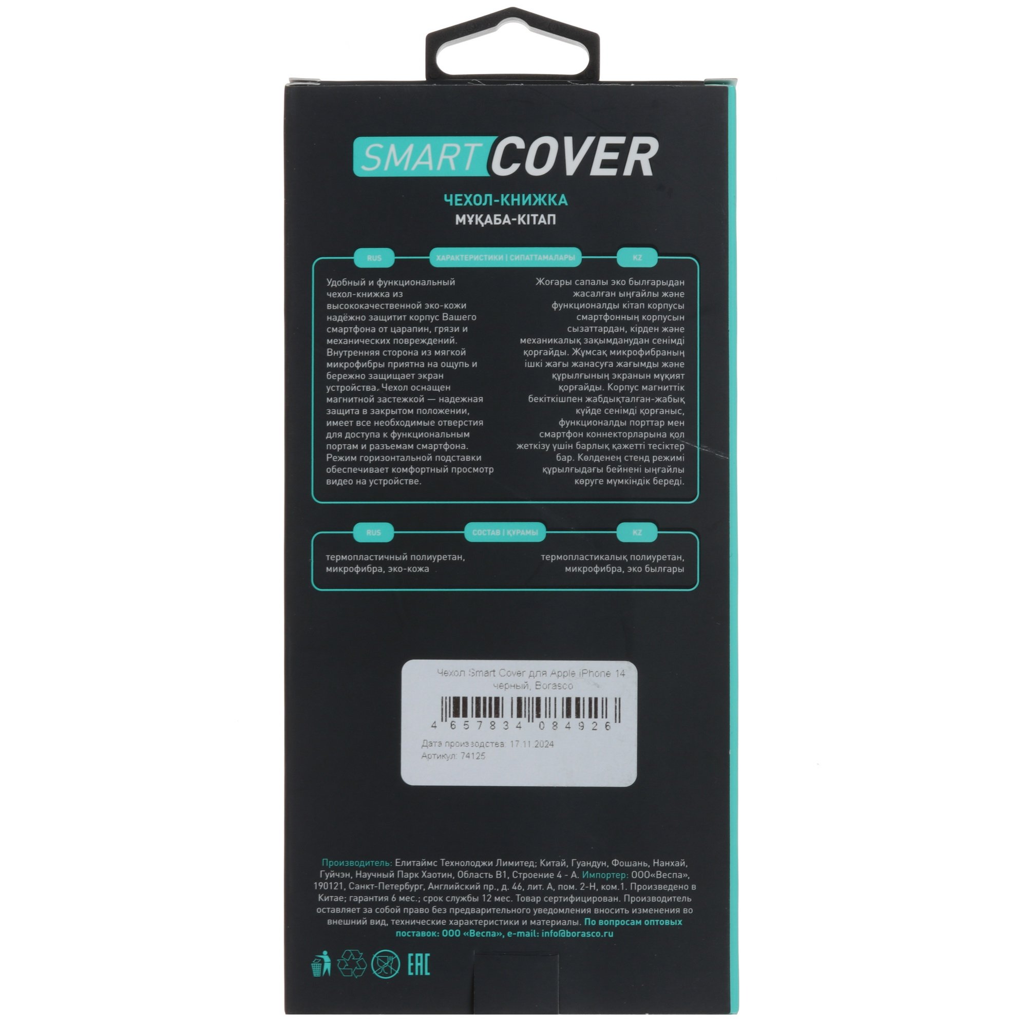 Модель Borasco Smart Cover для Apple iPhone 14 с однотонным черным дизайном выполнена из искусственной кожи. Этот материал прост в уходе, устойчив к износу и воздействию влаги. Аксессуар плотно прилегает и не царапает корпус, смягчает удары при случайном падении. Сзади есть карман для банковской карты и горизонтальная подставка для удобного просмотра видео при установке устройства на стол или другую поверхность.