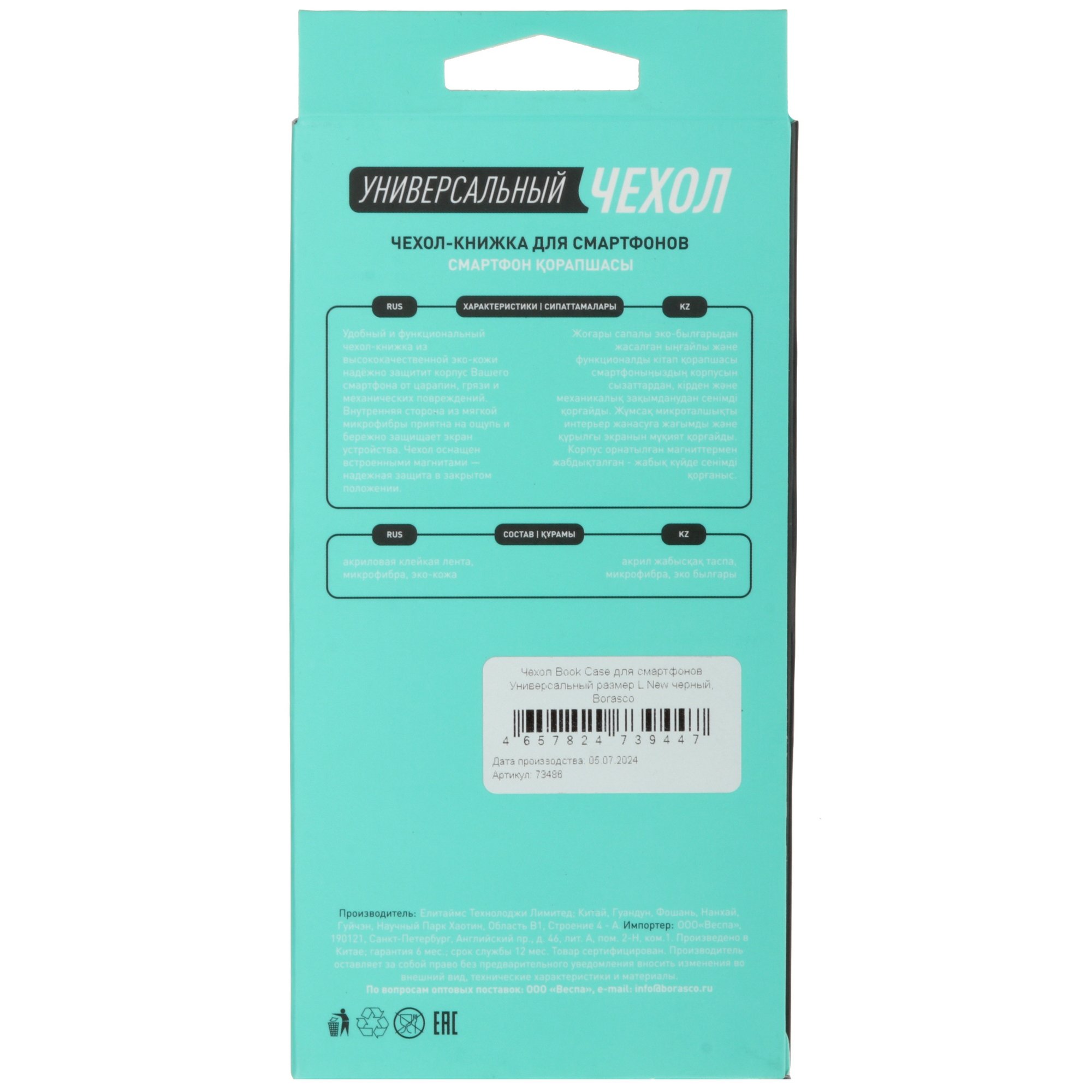 Чехол-книжка BoraSCO черного цвета устанавливается на корпус смартфонов диагональю 6.9". Он выполнен книжки и фиксируется к задней панели смартфона при помощи 3М-скотча. Аксессуар защищает от царапин и сколов не только корпус, но и экран устройства. На внутренней стороне есть карман для карт и купюр. Это позволяет не носить с собой кошелек.