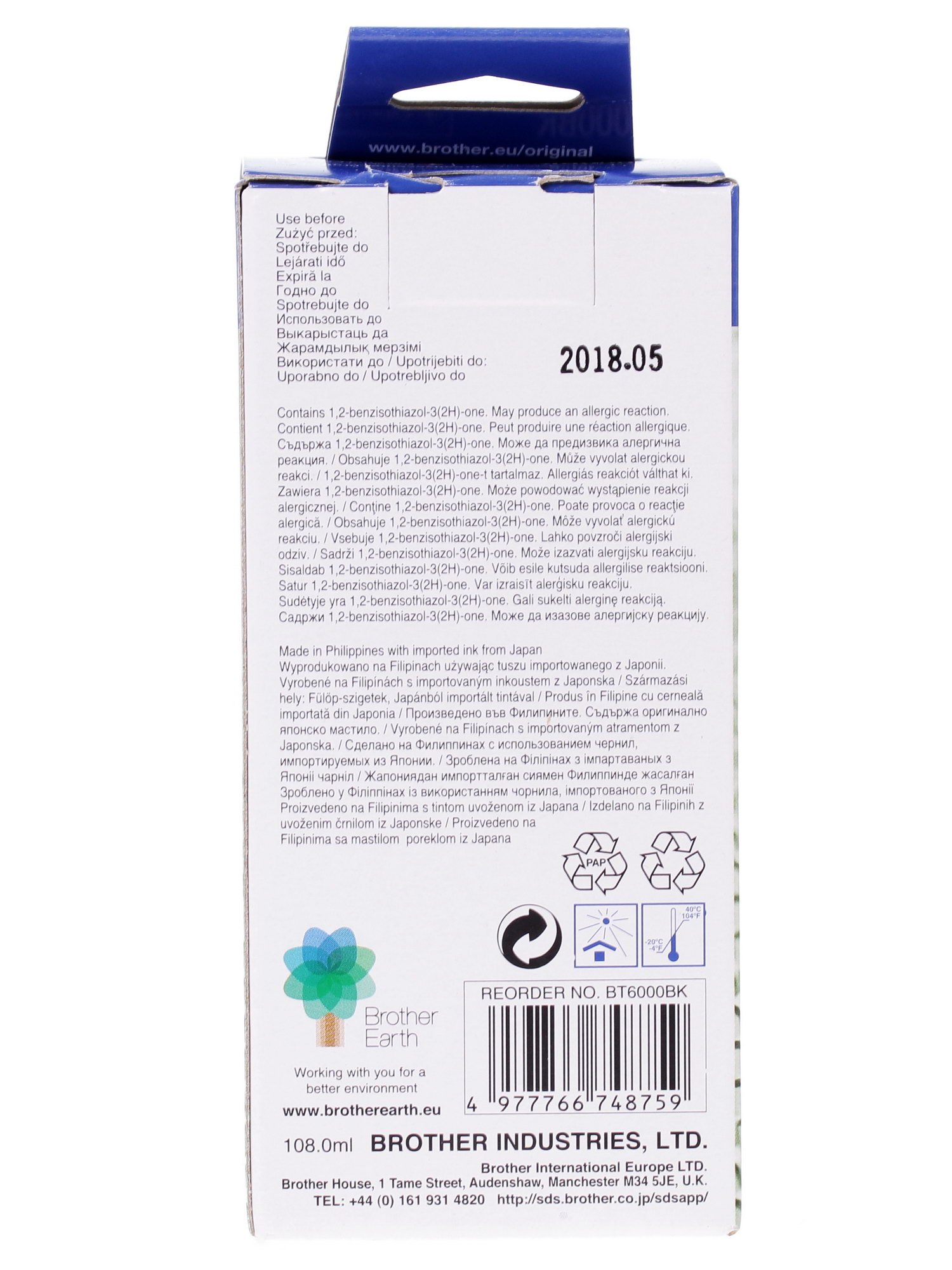 Чернила Brother BT6000BK черного цвета поставляются в пластиковой емкости, объем состава составляет 108 мл. Данное количество рассчитано на распечатку документов и различных материалов в смешанном режиме в количестве 6000 листов форм-фактора А4, эта информация подтверждена исследованиями по методике стандарта ИСО/МЭК 24712.