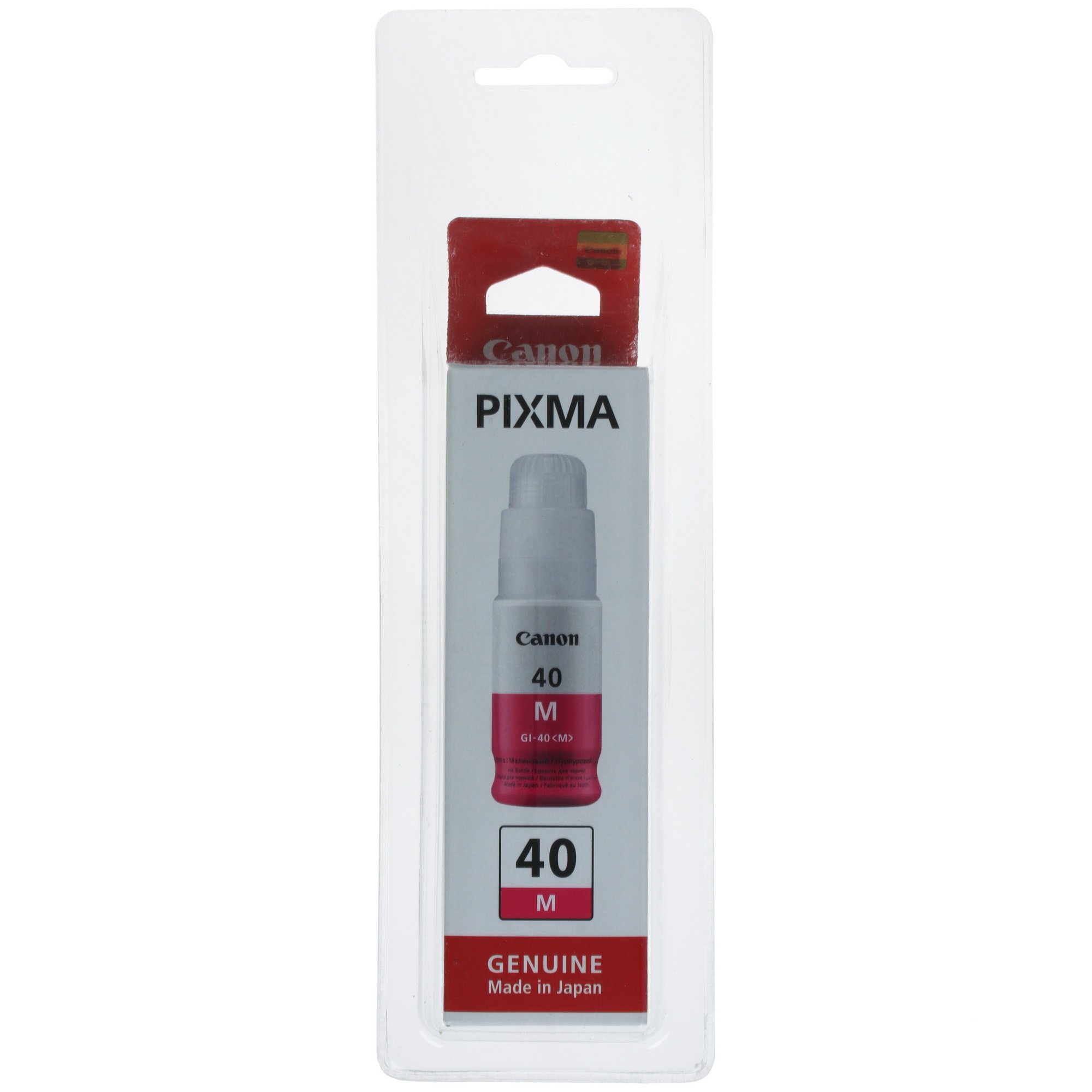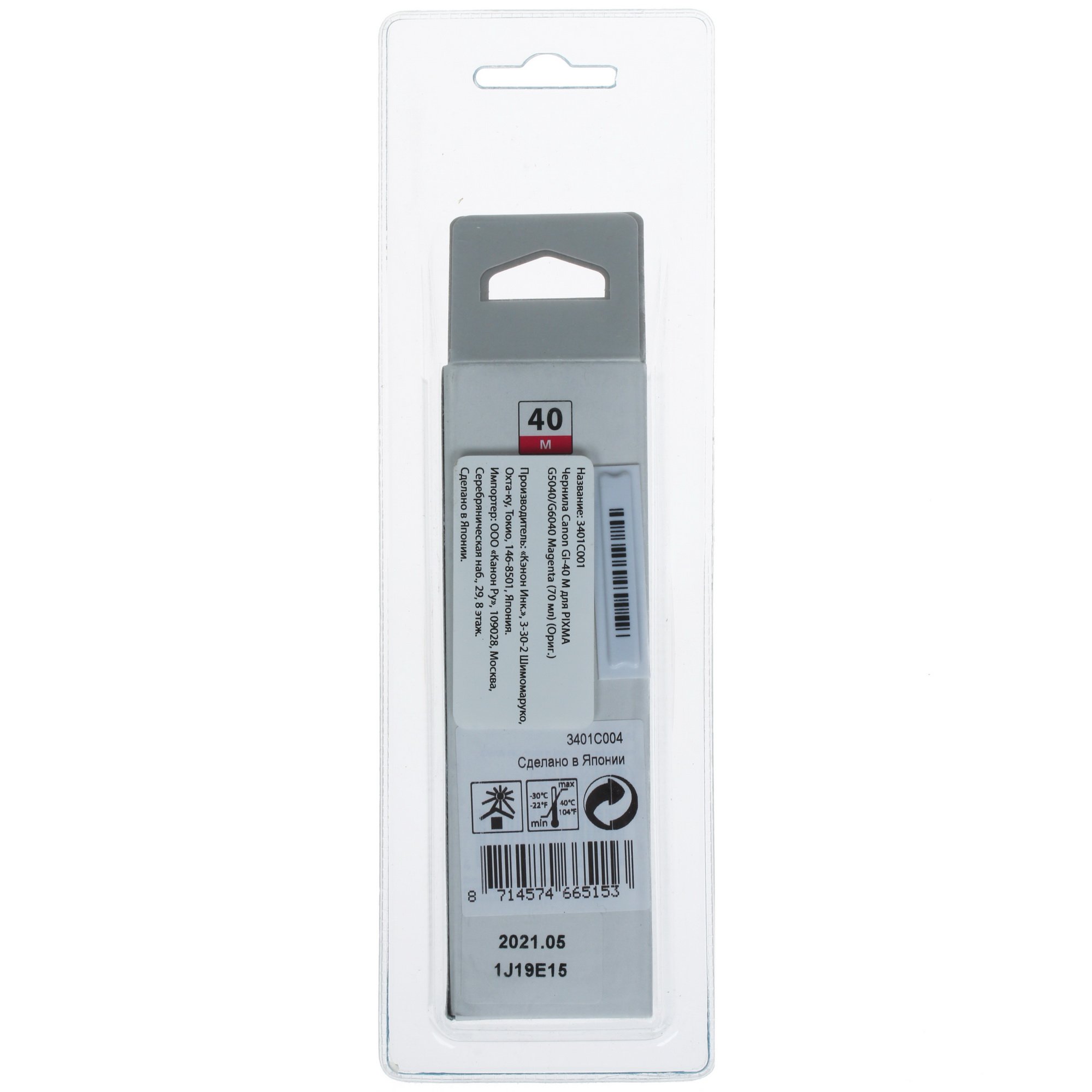 Чернила Canon GI- 40 M представлены в пурпурном цвете. Позволяют обеспечивать достоверную передачу цвета и полутонов на фото при печати на всех видах специальной фотобумаги. Расходные материалы расфасованы в особые флаконы емкостью по 70 мл для комфортной заправки отсеков печатного устройства. Небольшой объем также обеспечивает чистоту ваших рук, позволяя не делить и не хранить остатки пигмента, а использовать его за один раз.