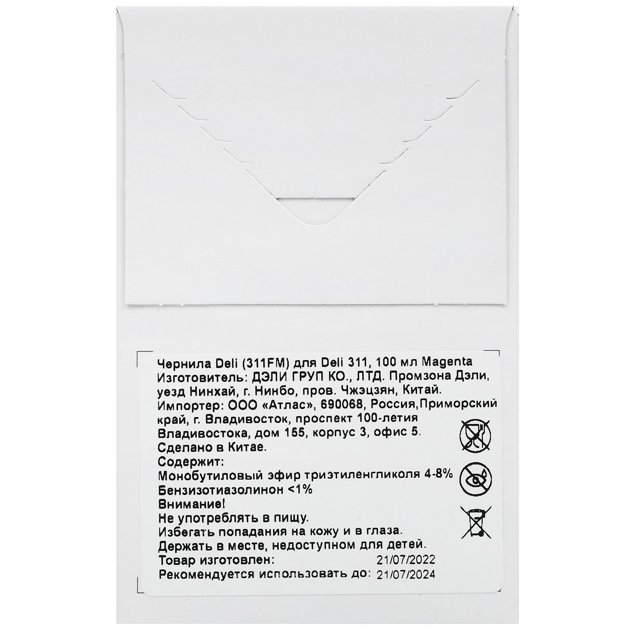 Чернила Deli 311FM являются оригинальным расходным материалом, который отличается совместимостью с моделями принтеров D311NW-EA1 и Deli D311NW на основе струйной технологии печати. Чернила созданы с применением пигментных красящих частиц пурпурного цвета. Они обеспечивают формирование на различных бумажных носителях четких отпечатков с яркими и насыщенными оттенками. Deli 311FM выполнены в компактном флаконе с емкостью 100 мл. Заявленный производителем ресурс чернил составляет в пределах 8000 страниц.