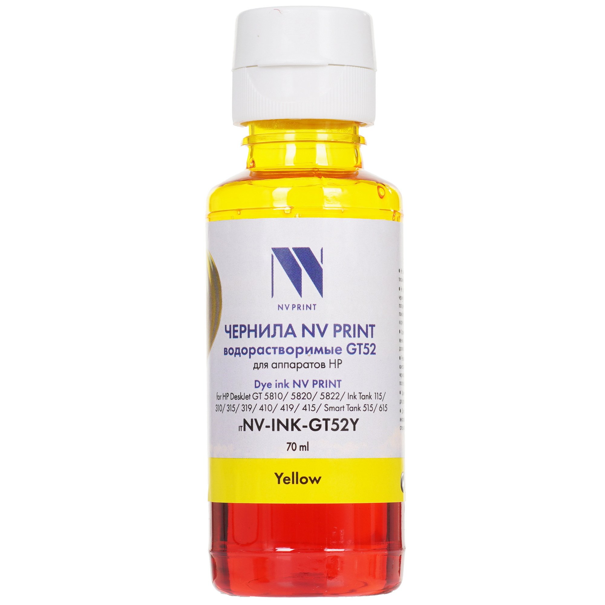 Чернила NVPrint водорастворимые GT52 для HP DeskJet GT 5810, 5820, 5822, Ink Tank 115, 310, 315, 319, 410, 419, 415, Smart Tank 515, 615 (70ml) Yellow
