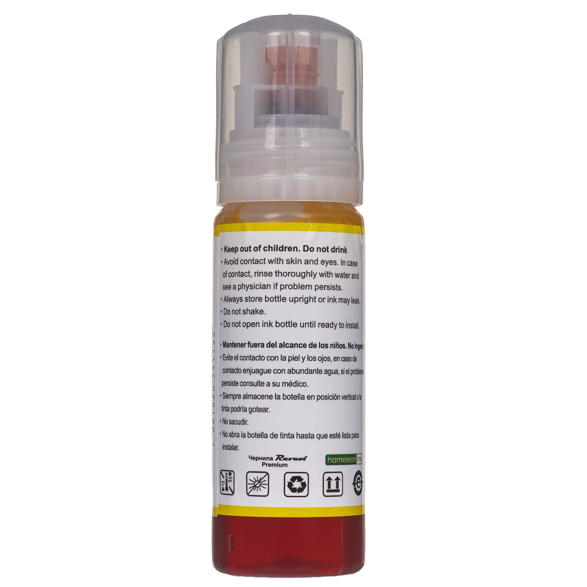 Чернила водорастворимые Revcol 6693 представлены в удобной бутылке емкостью 70 мл. Этого достаточно для печати примерно 100 - 120 стр. с изображениями формата А4. Чернила сохраняют свою жидкую консистенцию и не засыхают, что облегчает прочищение емкостей при их замене.