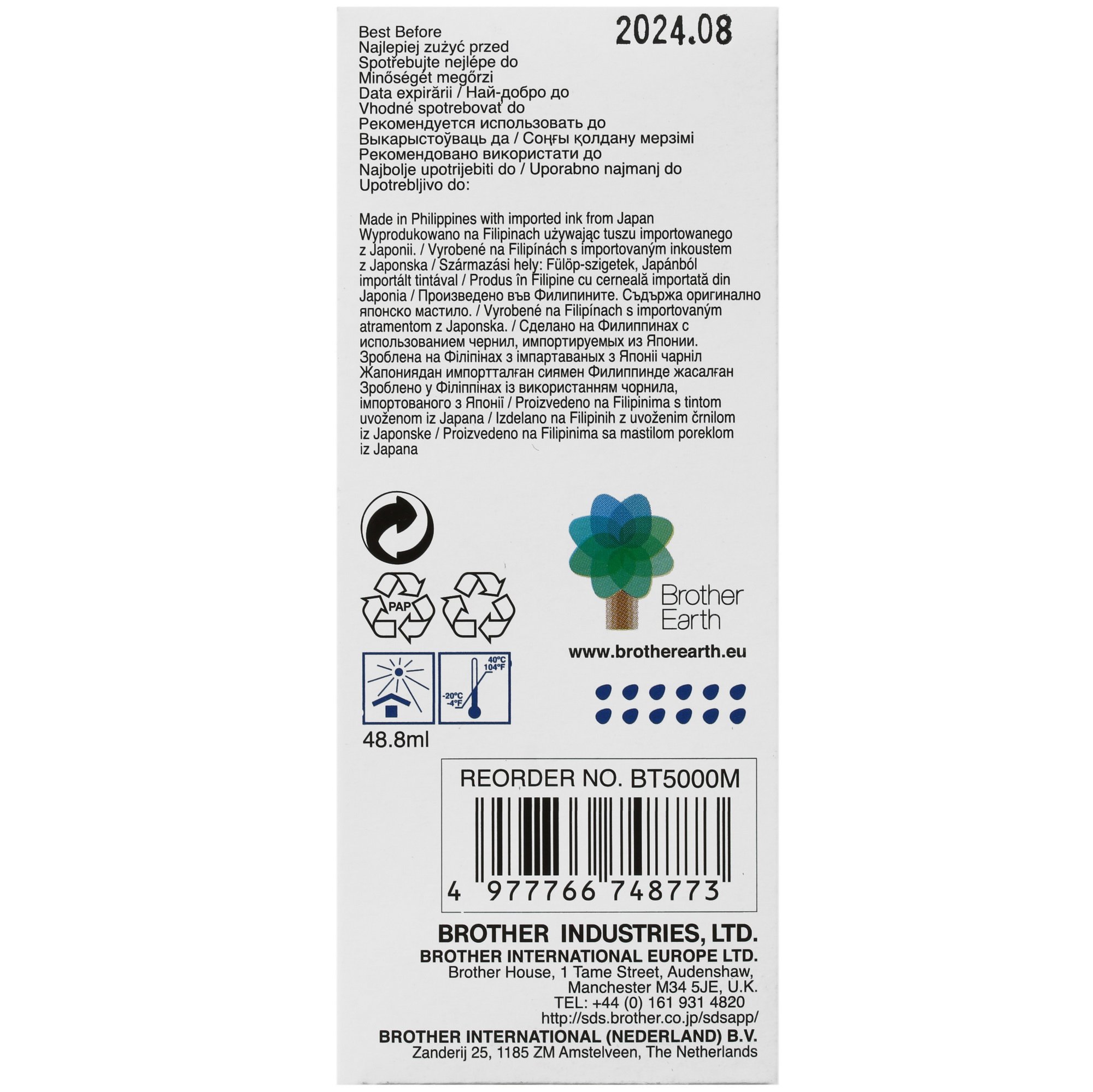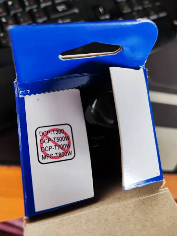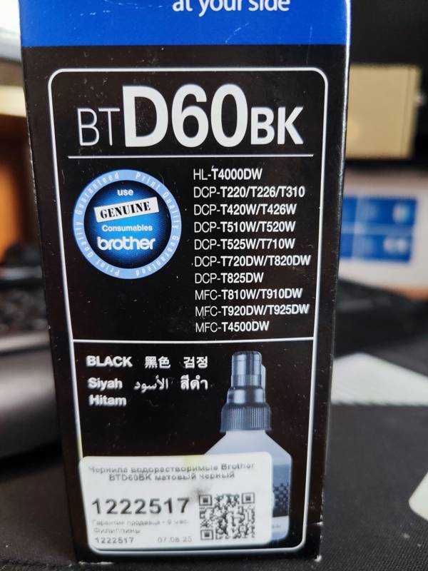 Чернила Brother BT5000M поставляются в пластиковом пузырьке в количестве 48,8 мл. Чернил в пузырьке хватает для распечатки 5000 страниц формата А4 в смешанном режиме, согласно методике тестирования ИСО/МЭК 24712. Также стоит обратить внимание, попытки использовать данные чернила пурпурного цвета в качестве «красного» в других принтерах не может привести к положительному результату.