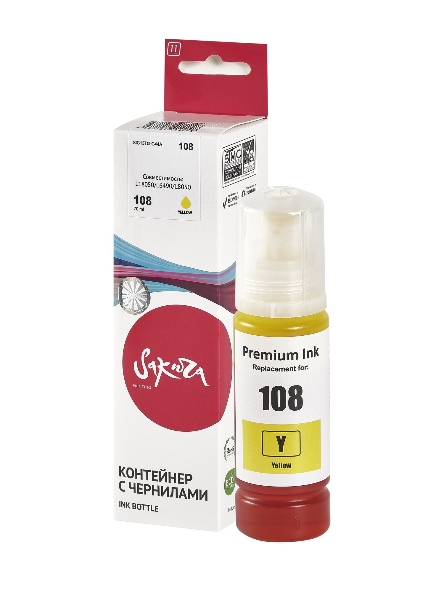 Контейнер с чернилами Sakura C13T09C44A (108 Y) для Epson, желтый, 70 мл.