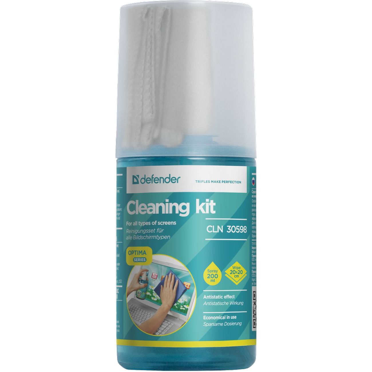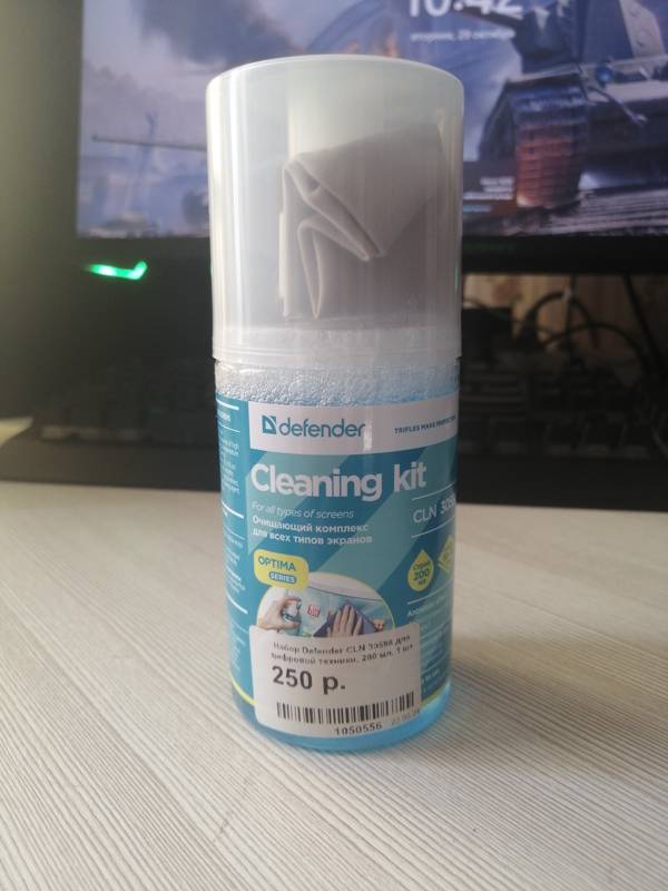 В набор Defender CLN 30598 входит также специальная жидкость для чистки экранов всех типов (в том числе и сенсорных). Она поставляется в емкости объемом 200 мл. Жидкость расходуется очень экономично, не портится, не высыхает и не испаряется даже после вскрытия упаковки, поэтому ее хватит надолго. Этот практичный набор сделает уход за техникой простым и приятным.