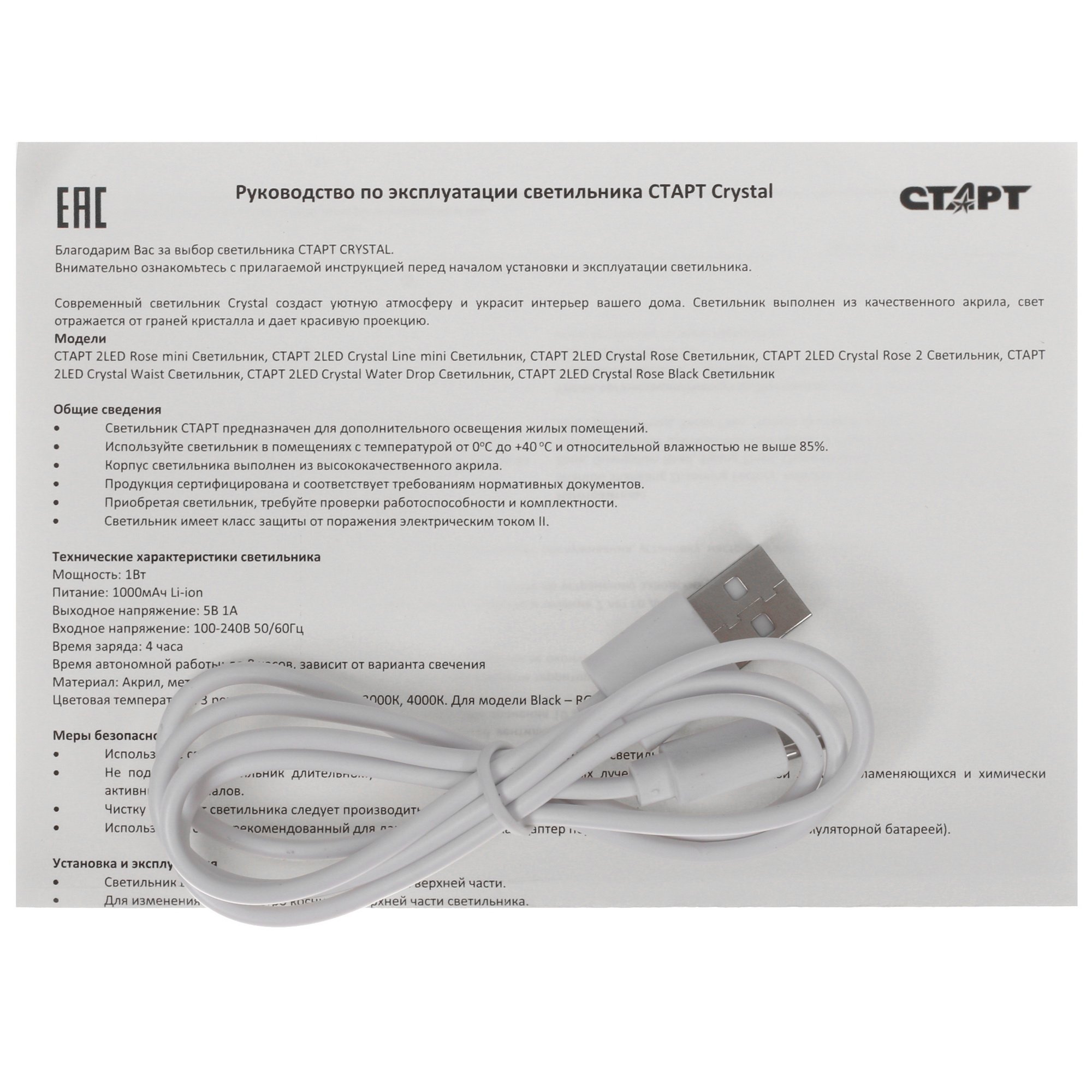 Светильник СТАРТ Crystal Waist работает от встроенной батареи, поэтому вы можете размещать устройство в любой комнате дома. Даже в детской, потому что светильник не нагревается во время эксплуатации. Для восполнения уровня батареи светильника требуется 4 часа. Его также можно подключать к сети через USB-кабель.