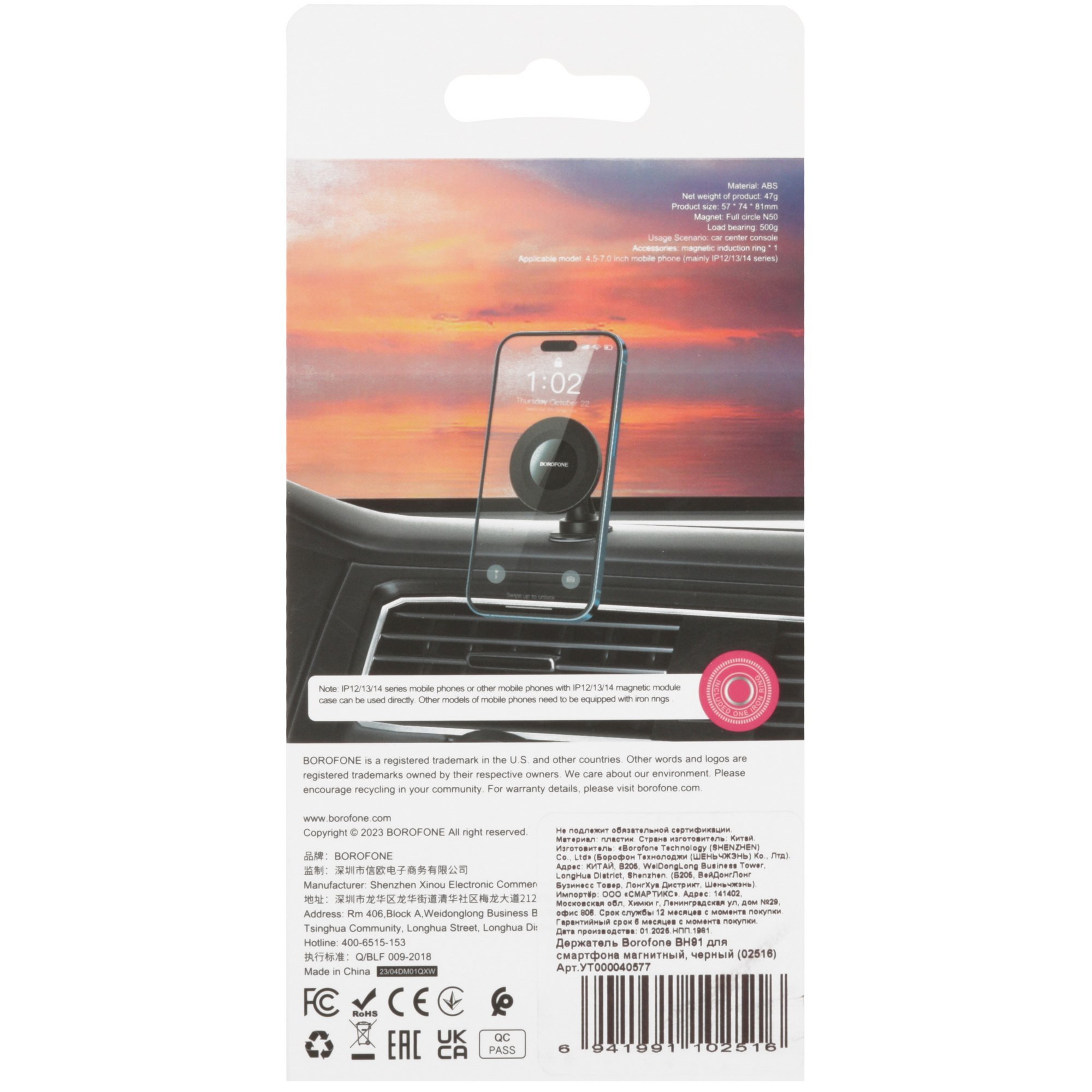 Держатель автомобильный Borofone BH91 совместим со смартфонами с диагональю 4.5-6.5". Крепление на приборную панель с помощью 3M-скотча позволяет разместить аксессуар в зоне видимости водителя. Надежный магнит удерживает смартфон и не дает ему упасть во время тряски и быстрой езды.