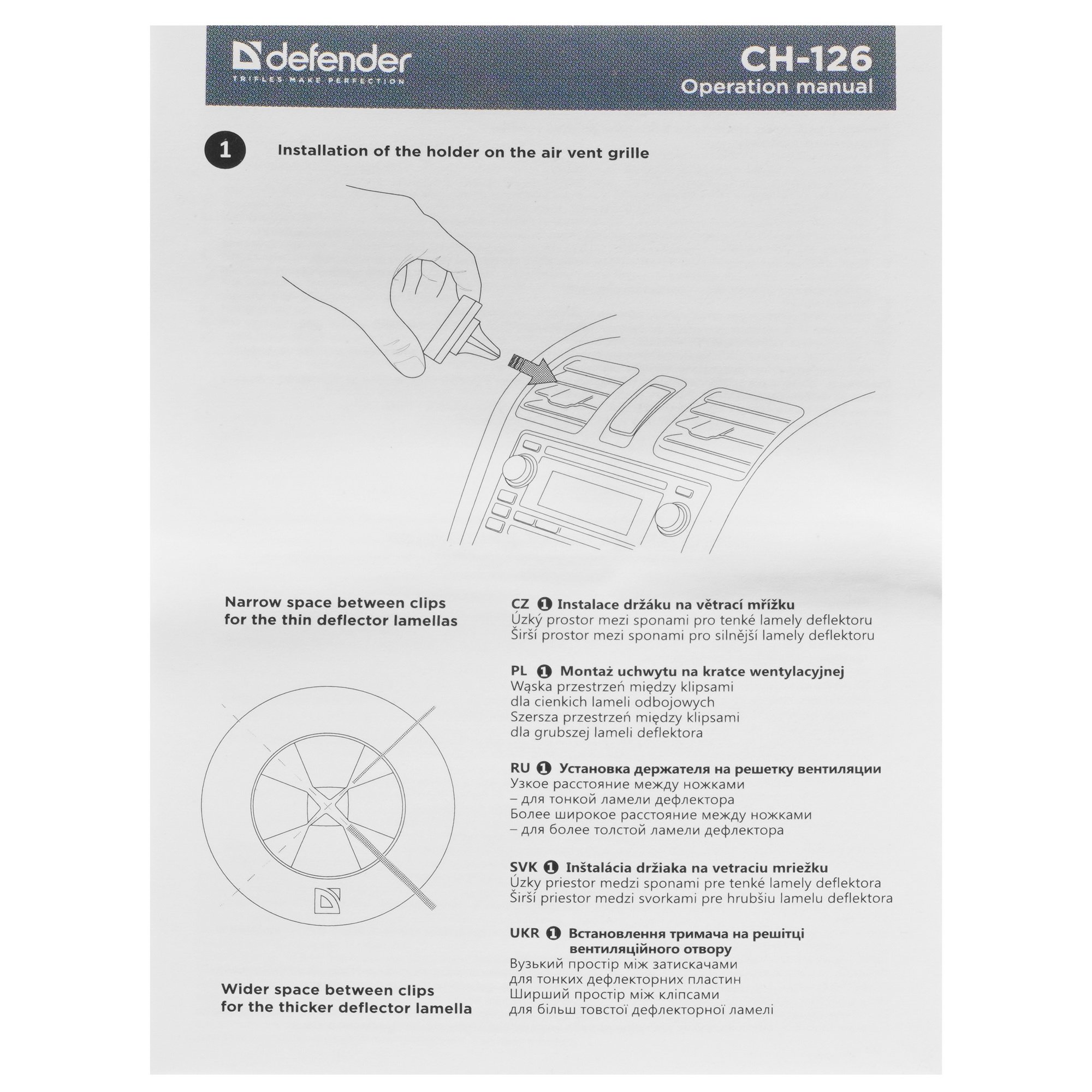 Корпус модели Defender CH-126 выполнен из металла и пластика, на его поверхности предусмотрены прорезиненные вставки, чтобы при фиксации мобильного устройства на его задней панели не появлялись повреждения. Использовать держатель можно с любыми смартфонами весом не более 500 г. Закрепленную на данной модели технику можно свободно вращать на 360 градусов, меняя положение экрана. Сам держатель устанавливается в вентиляционную решетку без риска ее поломки.