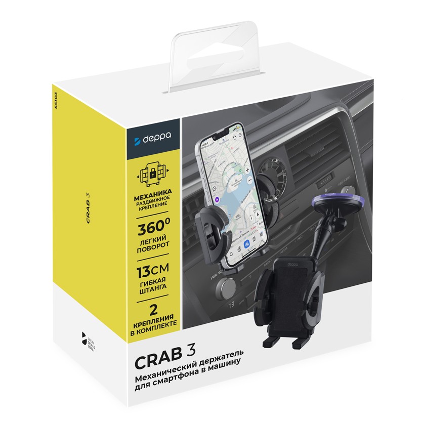 Держатель автомобильный Deppa Crab 3 – это полезный аксессуар, который дает возможность надежно закрепить мобильный телефон, MP3-плеер, GPS-навигатор или другое устройство на лобовом стекле или на поверхности панели приборов. Это высокотехнологичное изделие оптимально для работы с аппаратами, вес которых не превышает 300 грамм. Крепление осуществляется благодаря специальной прочной присоске, а удлинитель дает возможность выбрать максимально подходящее положение держателя. Deppa Crab 3 обеспечен мягкой подкладкой, которая позволяет сберечь состояние корпуса и дисплея от потертостей.