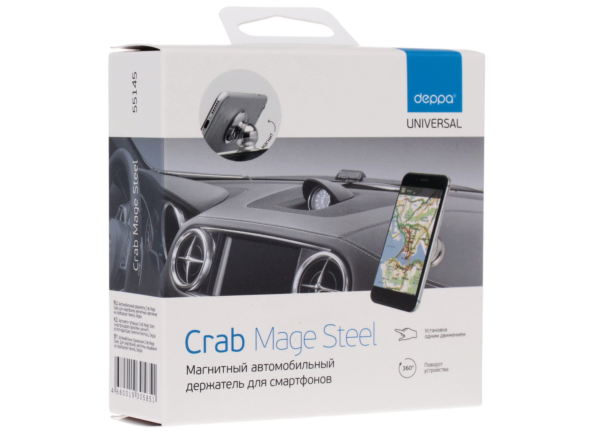 Deppa Crab Mage Steel выполнен в стильном серебристом цвете, поэтому он станет главной изюминкой интерьера салона транспортного средства. Головка устройства вращается на 360 градусов благодаря шарнирному креплению, поэтому вы сможете выбрать угол, наиболее подходящий для обзора экрана вашего смартфона. Представленная модель универсальна и не привязана к какой-либо определенной марке или модели портативной техники.