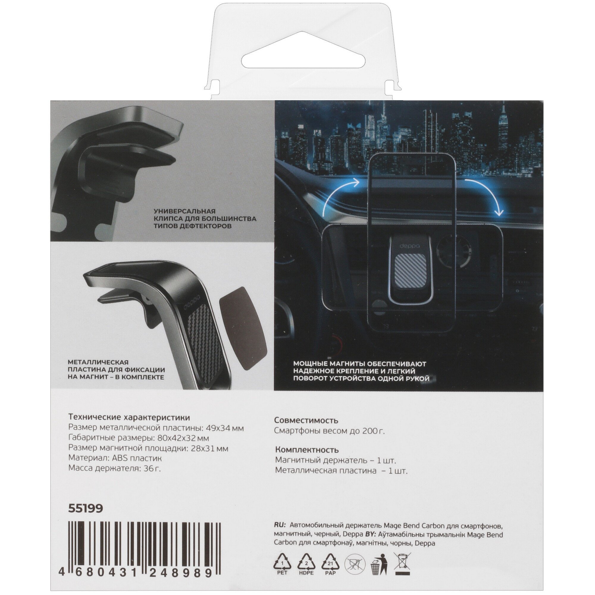 Держатель автомобильный Deppa Mage Bend Carbon благодаря четырем неодимовым магнитам и металлической пластине прочно фиксирует мобильное устройство во время поездок. Он крепится к вентиляционной решетке с помощью зажимного механизма. Магнитная платформа позволяет свободно вращать смартфон на 360 градусов и не ограничивает обзор информации на экране. Корпус держателя изготовлен из прочного пластика, устойчивого к ударам и механическим воздействиям. Deppa Mage Bend Carbon отличается компактными размерами.