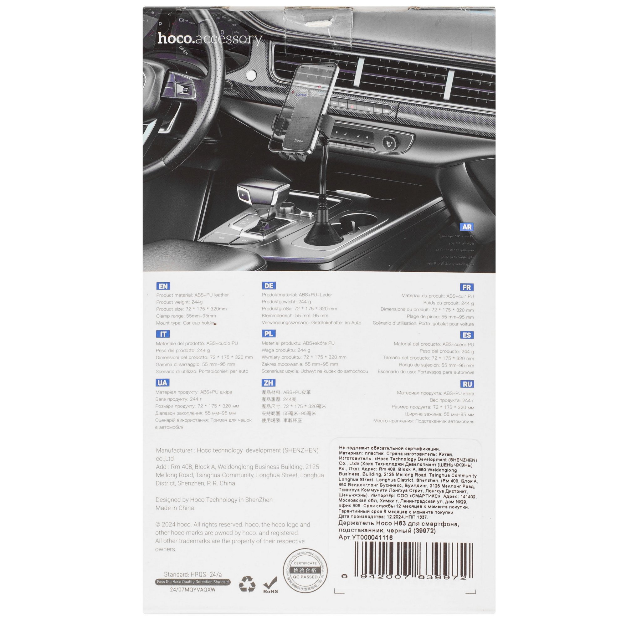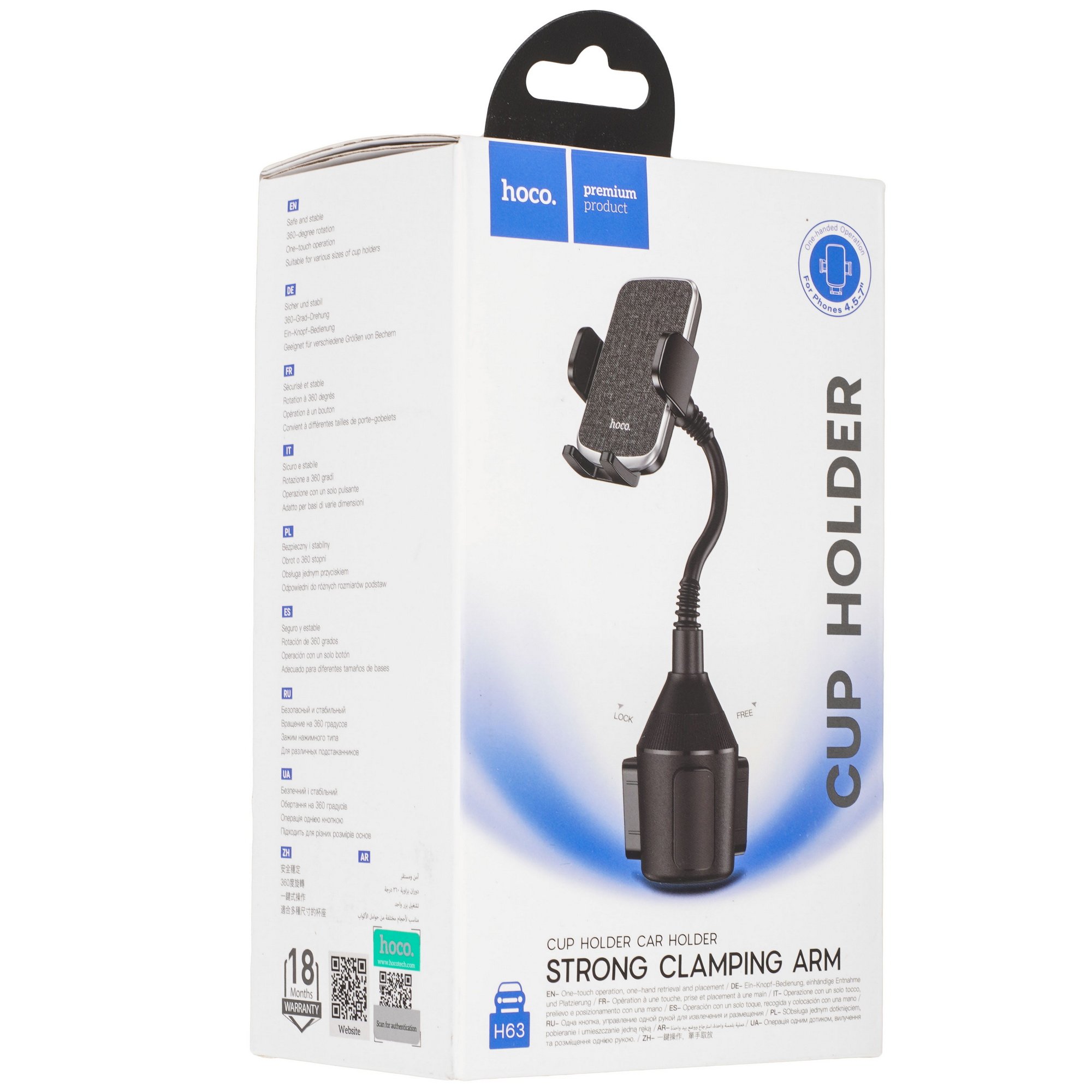Держатель автомобильный Hoco H63 оснащен зажимом для фиксации на подстаканнике. Это позволяет разместить аксессуар в зоне видимости водителя. При этом держатель не закрывает обзор и не мешает процессу вождения. Аксессуар выполнен из пластика с защищающими корпус смартфона от царапин силиконовыми накладками.