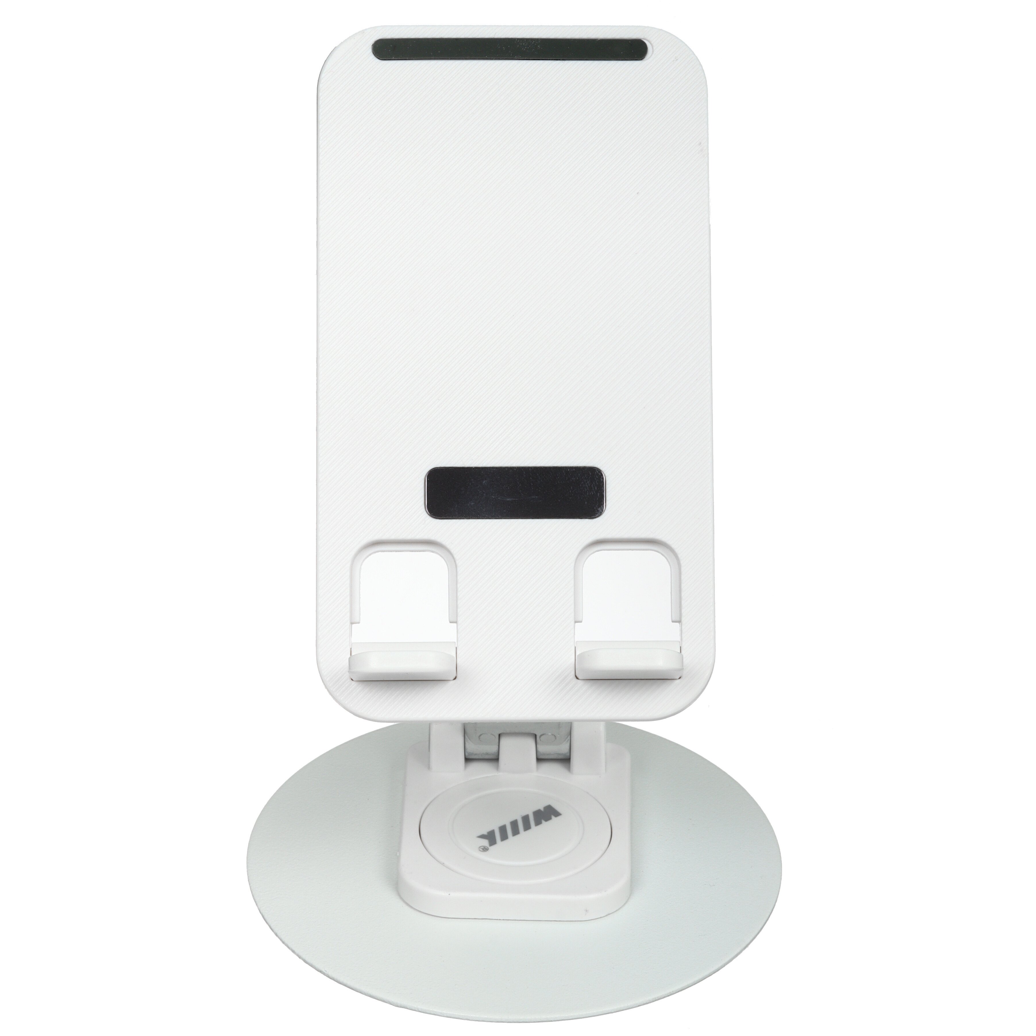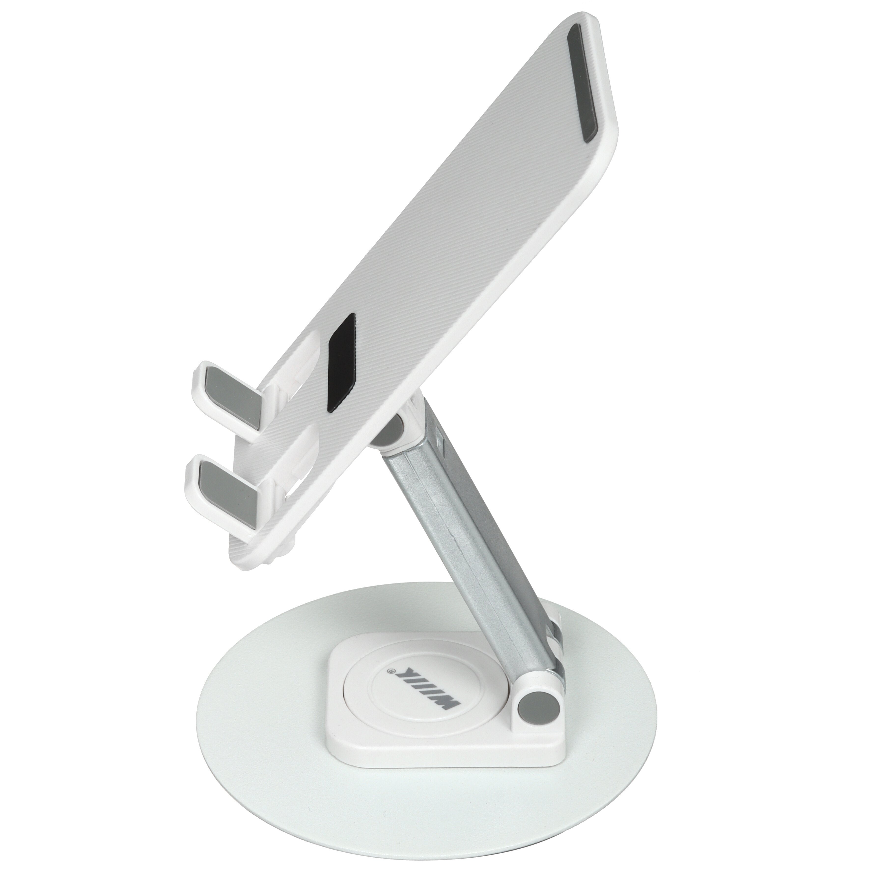 Держатель настольный WIIIX DST-723 белого цвета с серебристым обеспечивает устойчивое положение и безопасное крепление смартфонов весом до 300 г. Модель устанавливается на стол, полку, любую другую горизонтальную поверхность с помощью подставки. Для фиксации устройства в держателе используется подставка.