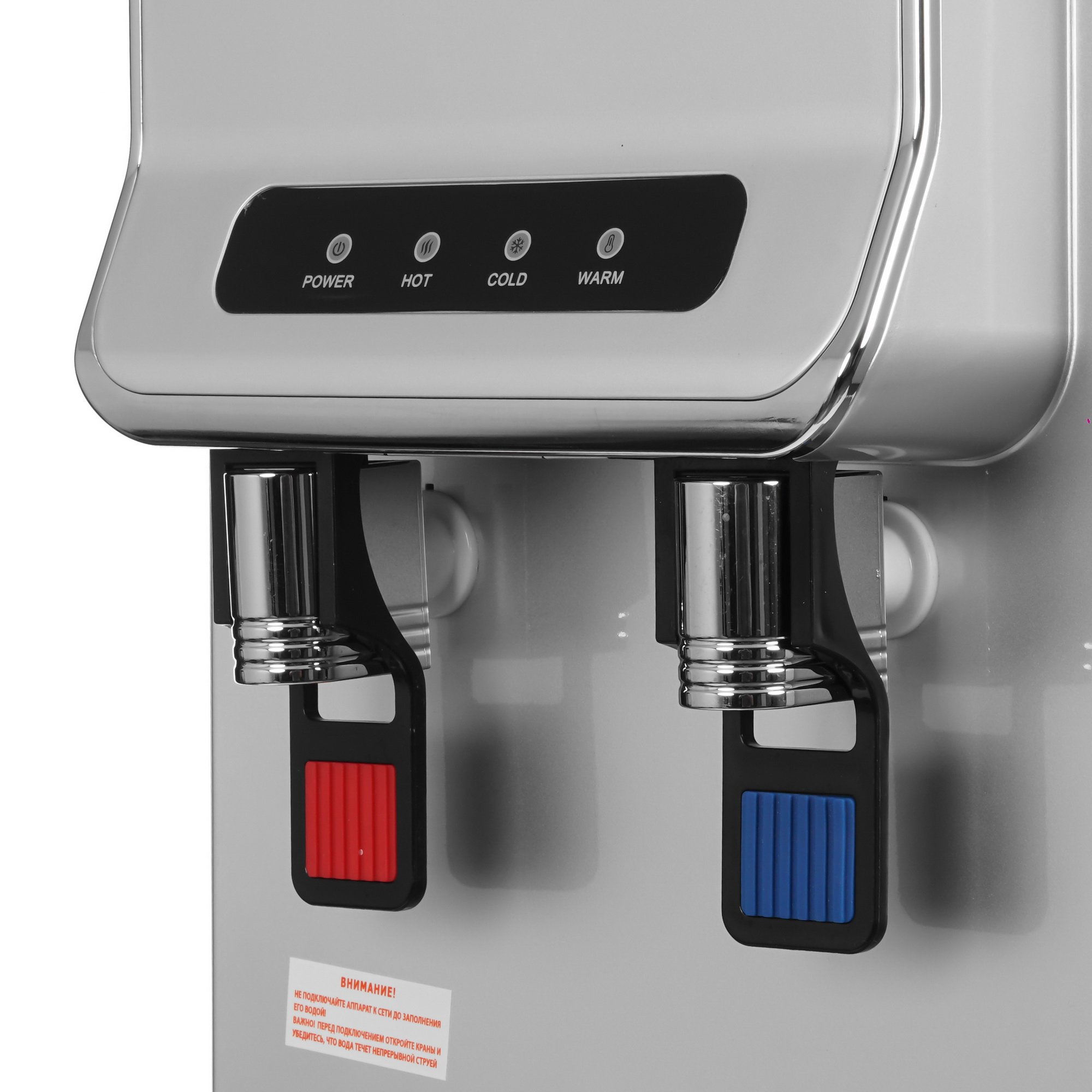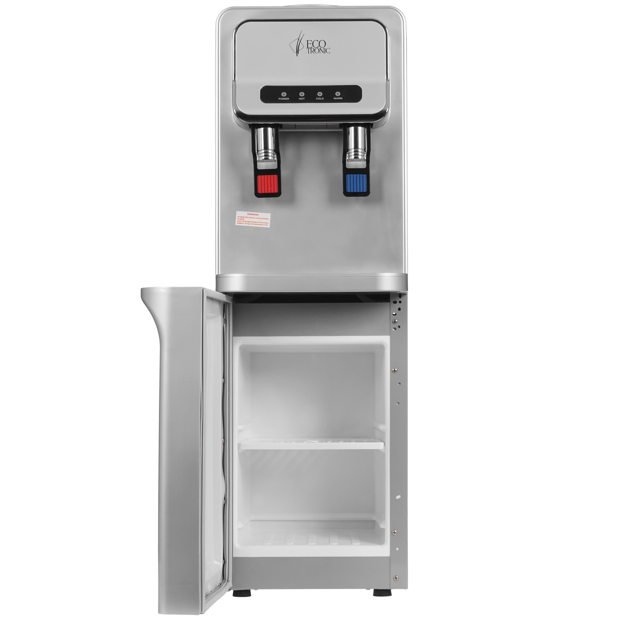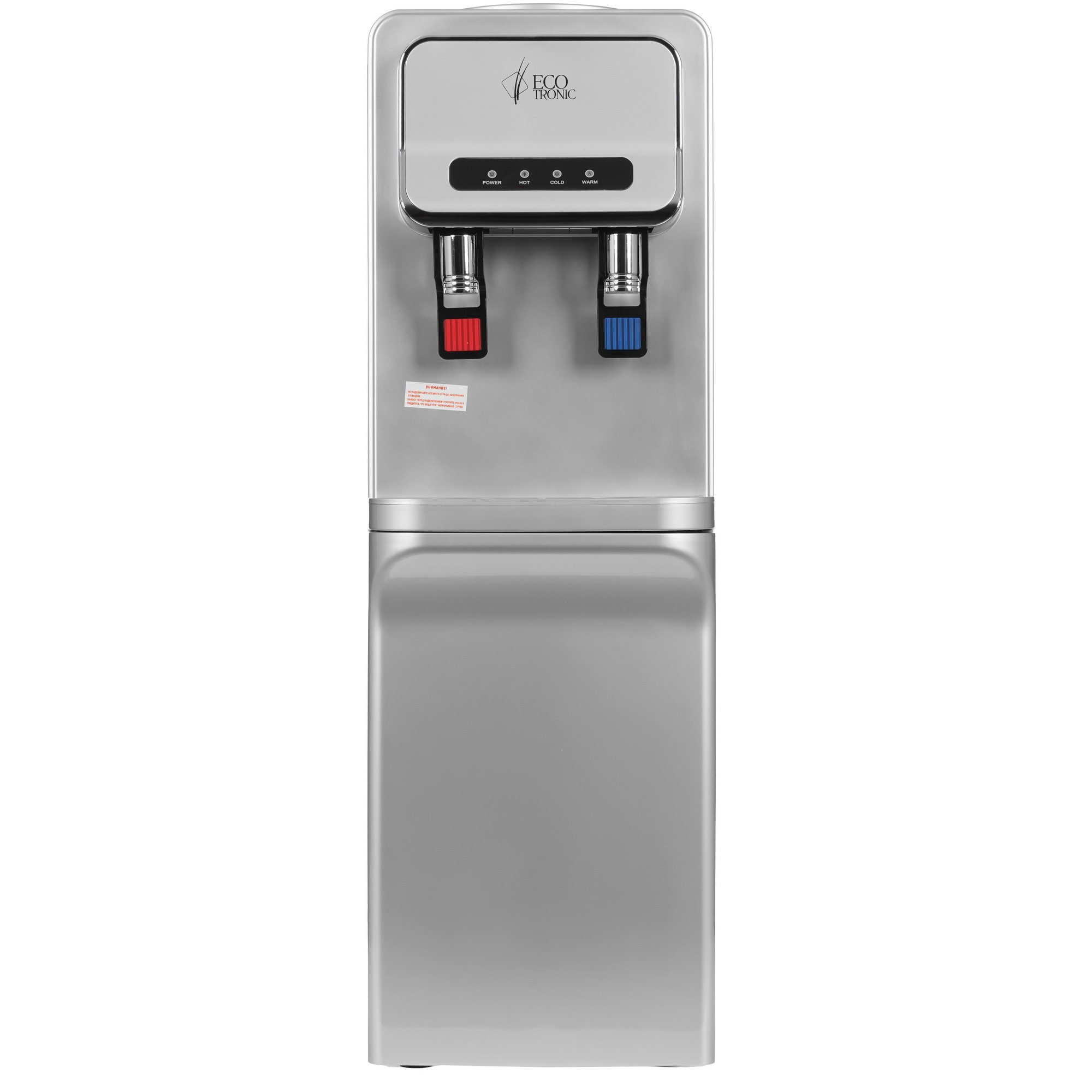 Серебристый напольный диспенсер Ecotronic V32-LCE работает в режимах нагрева и охлаждения воды. Модель оснащена двумя кранами с функцией подачи нажатием кружкой. Такой механизм не требует прикасания рукой к устройству для соблюдения гигиены в общественном месте. Верхнее размещение бутыли позволяет визуально видеть количество оставшейся воды.
