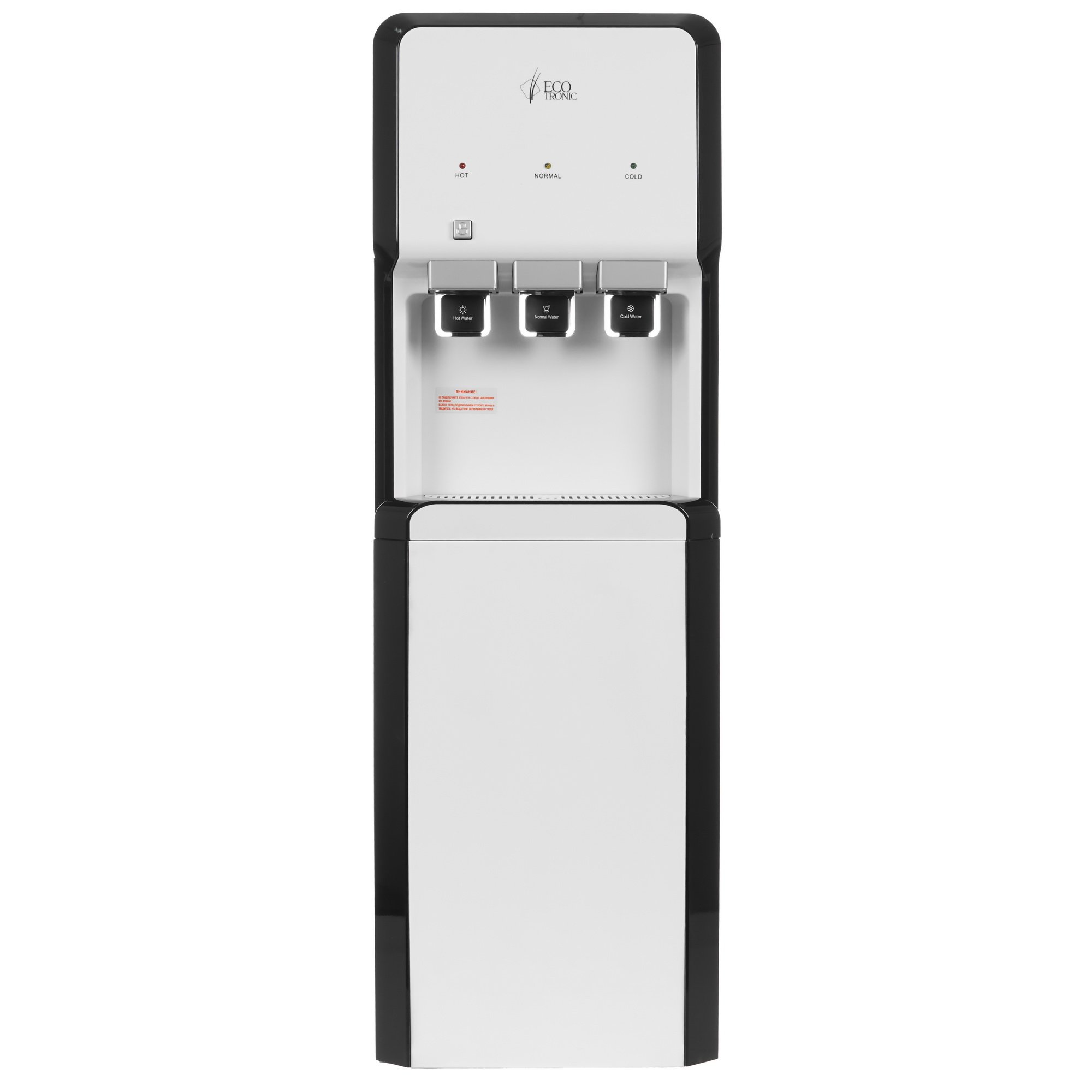 Белый напольный диспенсер Ecotronic V33-LCE работает в режимах нагрева и охлаждения воды. Модель оснащена тремя кранами с функцией подачи нажатием кружкой и защитой от детей. Такой механизм не требует прикасания рукой к устройству для соблюдения гигиены в общественном месте. Верхнее размещение бутыли позволяет визуально видеть количество оставшейся воды.