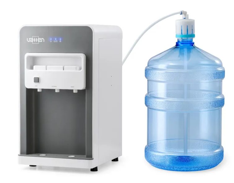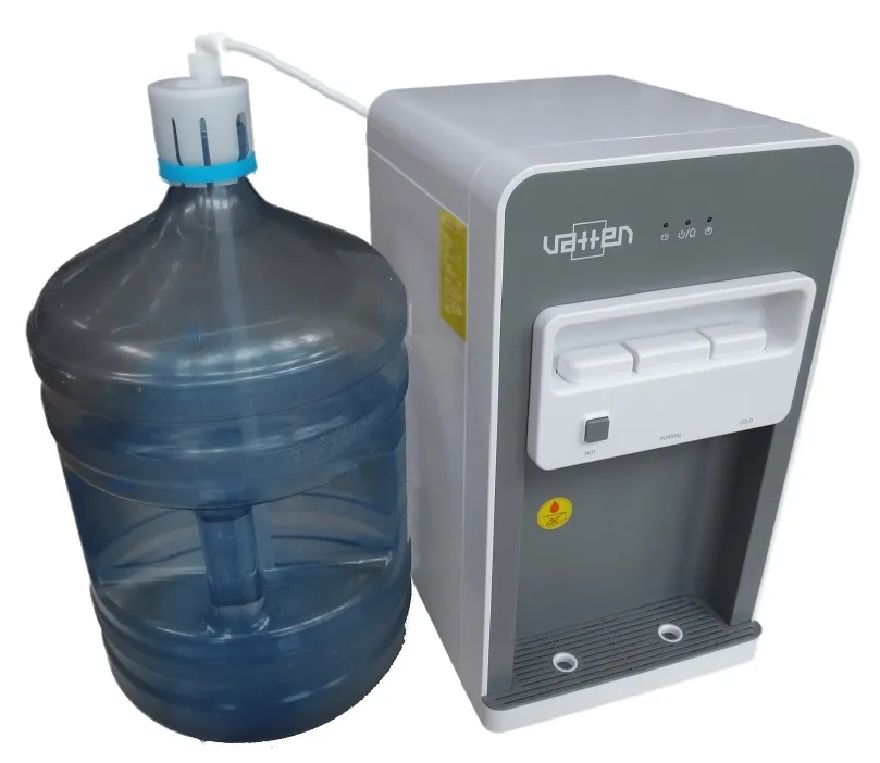 Диспенсер Vatten LD53JK белого цвета ‒ встраиваемый прибор размерами 26x49x33 см, предназначенный для подачи воды из бутыли, а также для нагрева и охлаждения. Настольная конструкция позволяет расположить его на шкафчике или столе. Бутыль для подачи воды можно спрятать за дверцей в шкаф или просто поставить недалеко от кулера. Она подключается при помощи гибкой трубки.