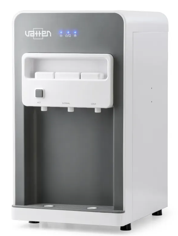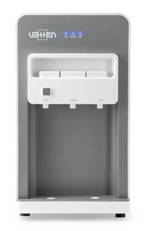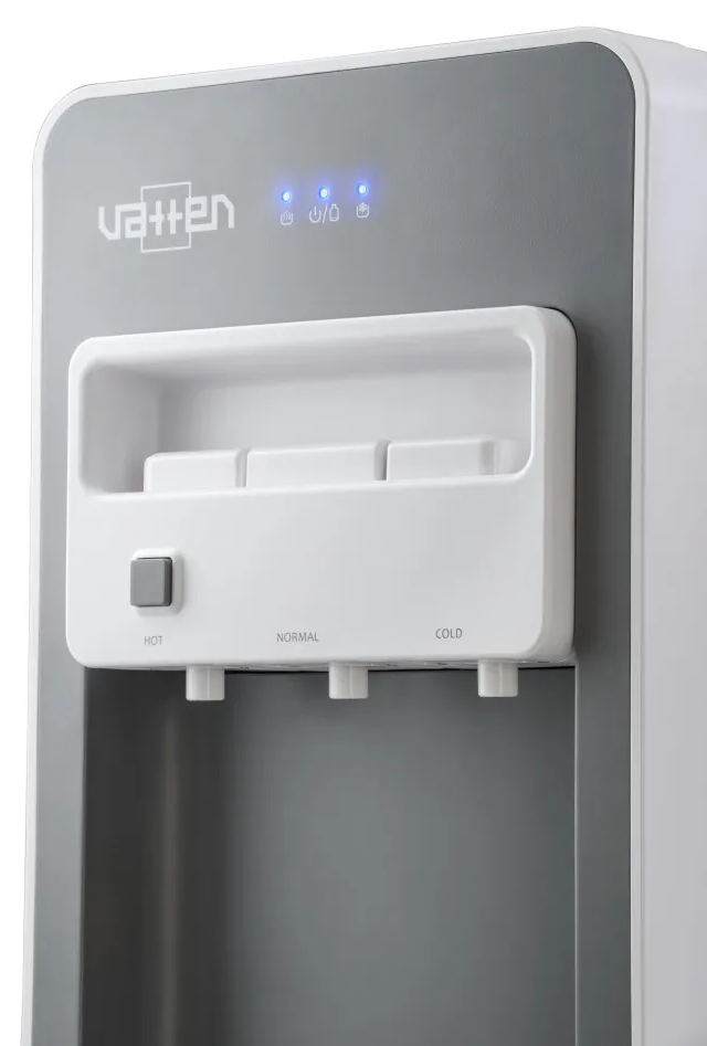 Vatten LD53JK использует 3 краника с активацией кнопками-клавишами. Горячий краник можно заблокировать, что защищает от ожогов при нажатии кнопки детьми. Прибор поддерживает компрессорную систему охлаждения с производительностью 2 л/ч. Обладая мощностью 600 Вт, диспенсер позволяет получить 5 л горячей воды за 1 ч. Внутри корпуса находятся емкости для горячей воды объемом 3 л и холодной воды объемом 0.8 л.