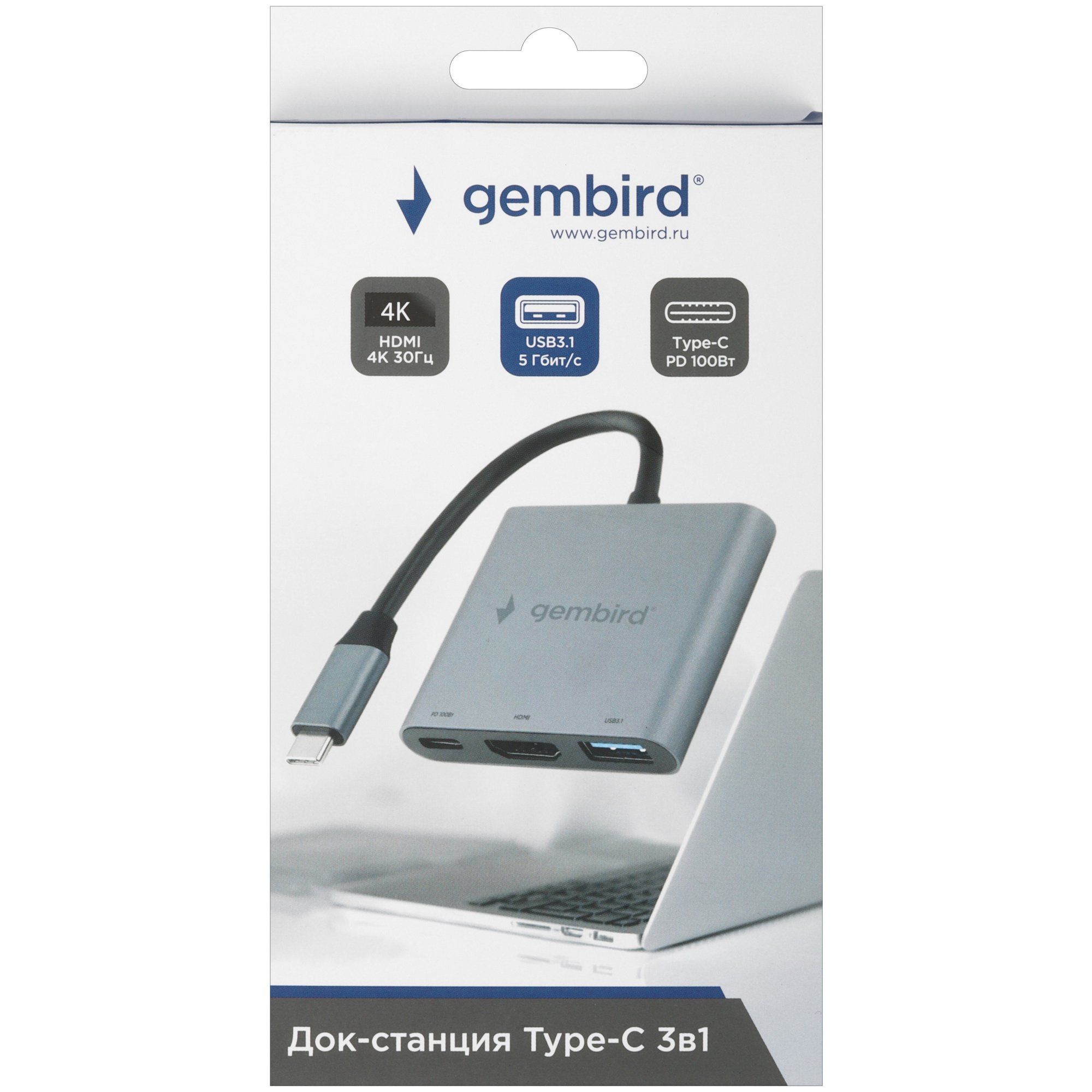 Док-станция Type-C Gembird UHB-D1, 5в1: 3хUSB3.1, Type-C PD100W, HDMI, кабель 17см, алюминий