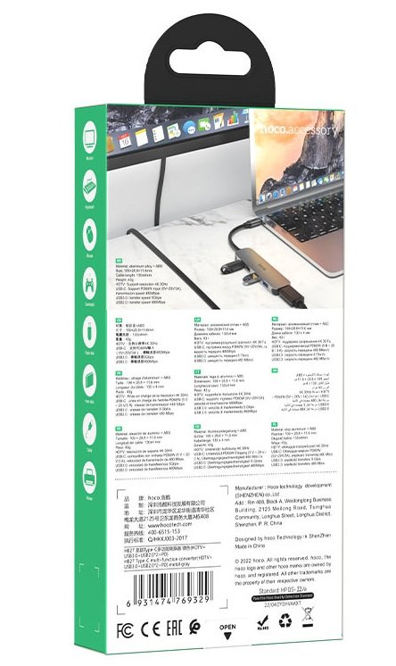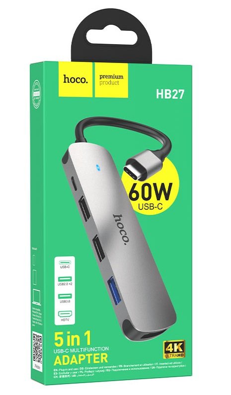 Док-станция Hoco HB27 серебристого цвета выполнена из алюминиевого сплава. Благодаря этому переходник обретает высокую теплоотдачу и работает бесперебойно. На его корпусе выполнены разъемы USB и HDMI. Через них подключается мобильная, цифровая техника, накопители памяти.