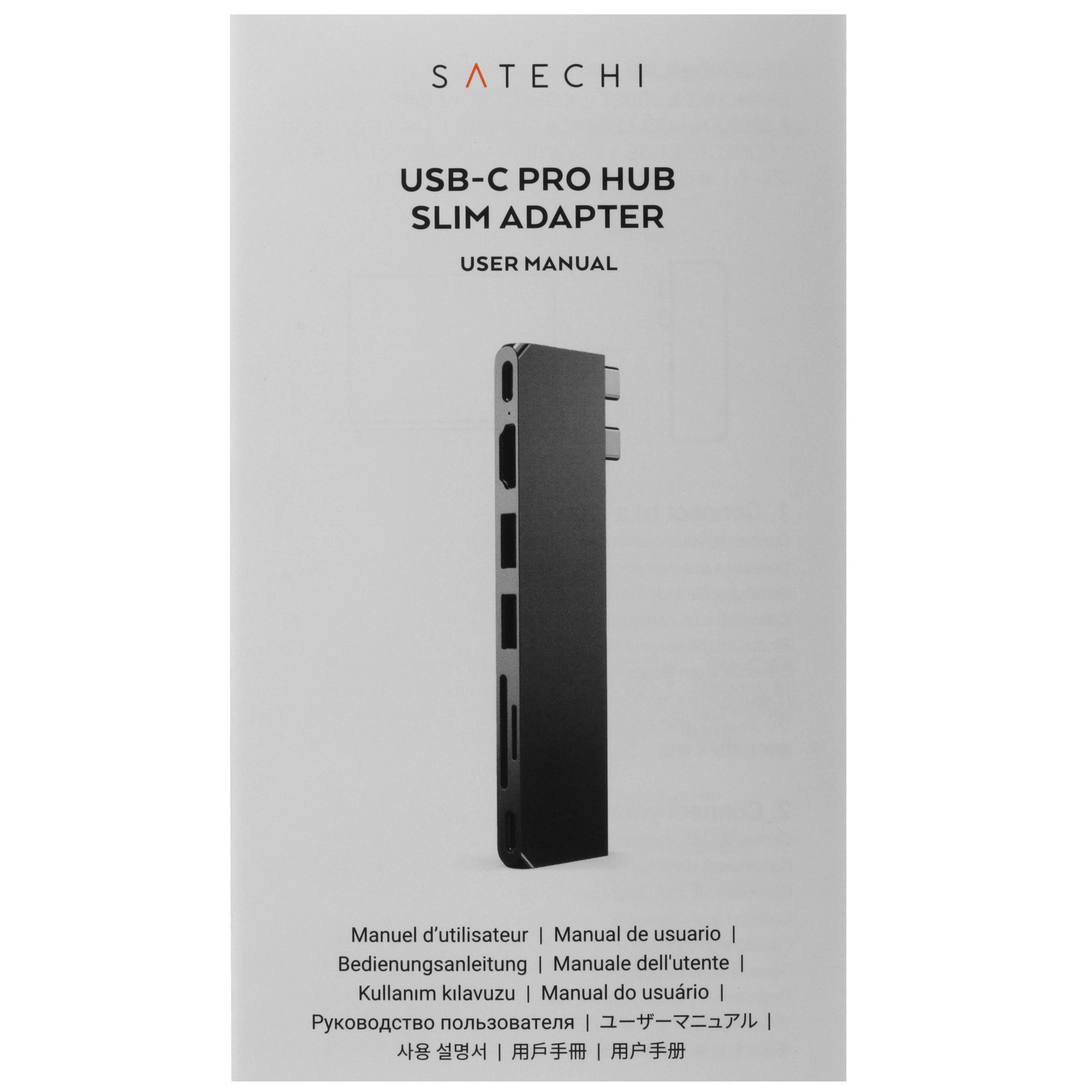Док-станция Satechi USB-C Pro Hub Slim Adapter в сером цвете корпуса имеет 7 портов для подсоединения внешних устройств. В их числе два USB Type-C, два USB Type-А, картридеры с поддержкой карт памяти SD и microSD, а также выход HDMI 2.0 для видеотехники.