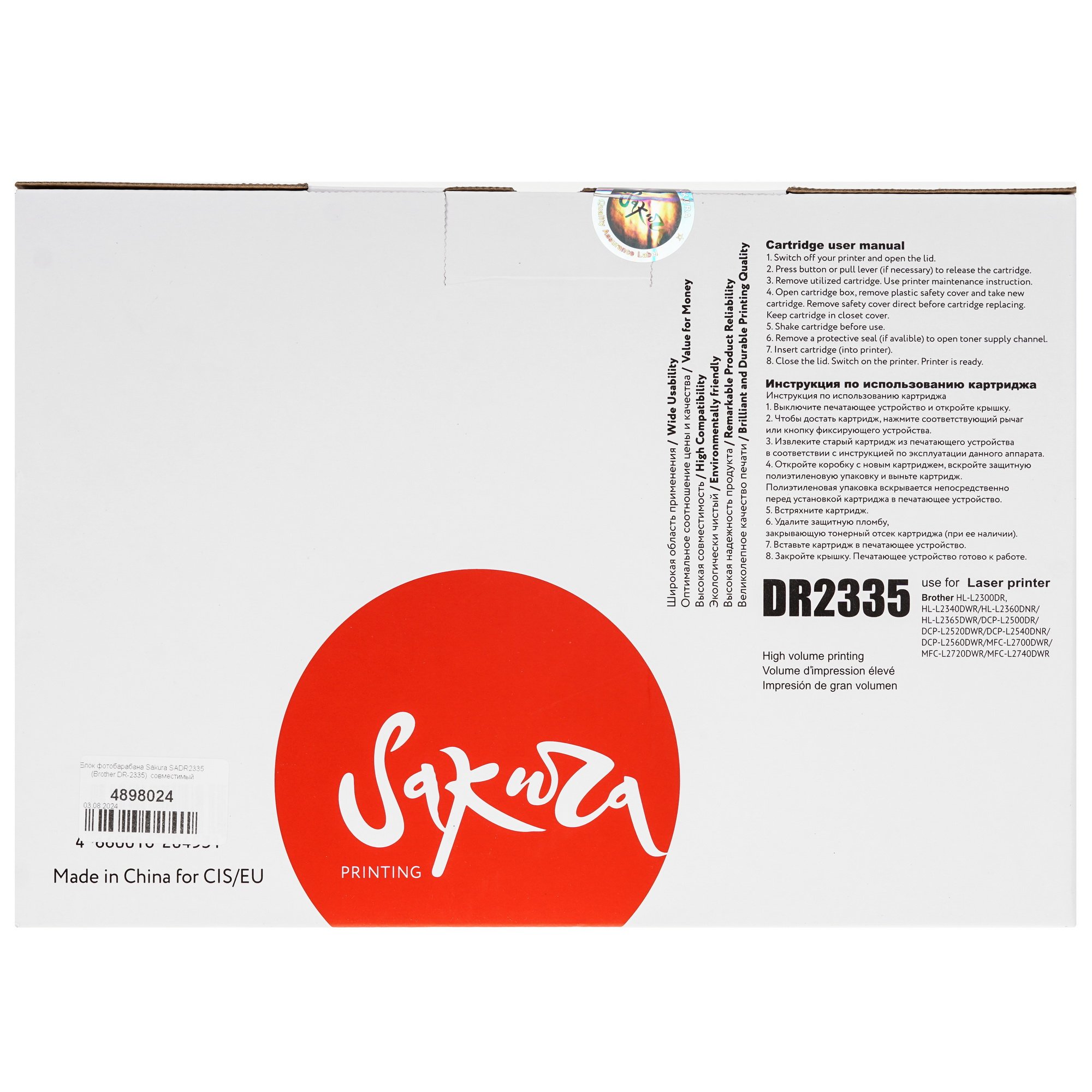 Использовать Sakura SADR2335 необходимо в составе МФУ бренда Brother. Разобраться с установкой картриджа самостоятельно поможет понятная инструкция на упаковке.