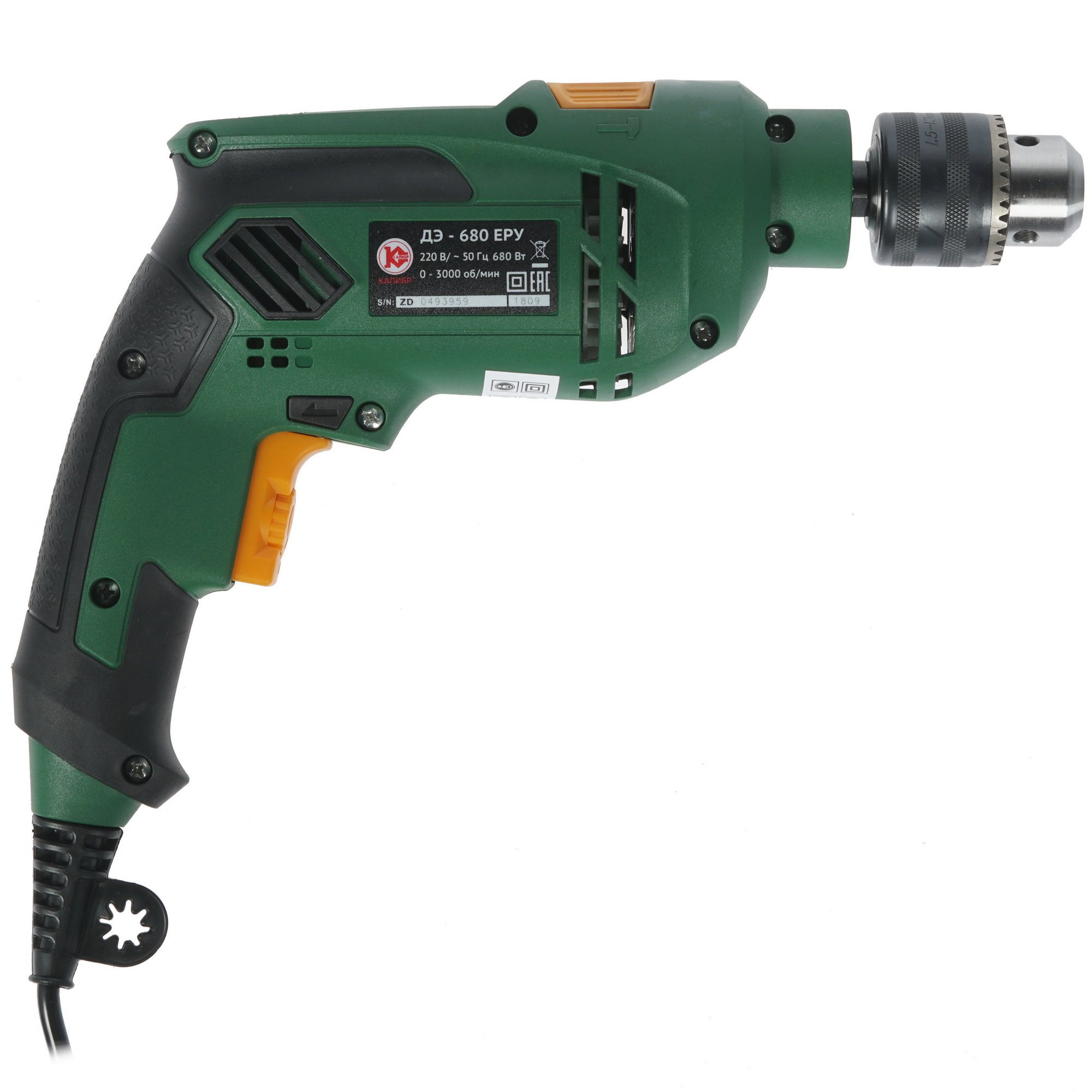 Калибр ДЭ-680ЕРУ использует ключевой патрон для крепления элементов оснастки. Модель поддерживает установку сверел с патроном диаметром от 1.5 до 13 мм. Обладая мощностью 680 Вт, прибор поддерживает скорость вращения 3000 об/мин, что обеспечивает успех в сверлении отверстий в любом материале. Скоростной показатель можно изменять благодаря предусмотренному регулятору. Функция "Реверс" позволит сверлу вращаться в обратную сторону. Преимущество дрели в компактной конструкции, а также в небольшом весе 1.68 кг, что позволит удобно держать устройство в одной руке. Дополнительная рукоятка позволит снять напряжение с руки при ударном сверлении.