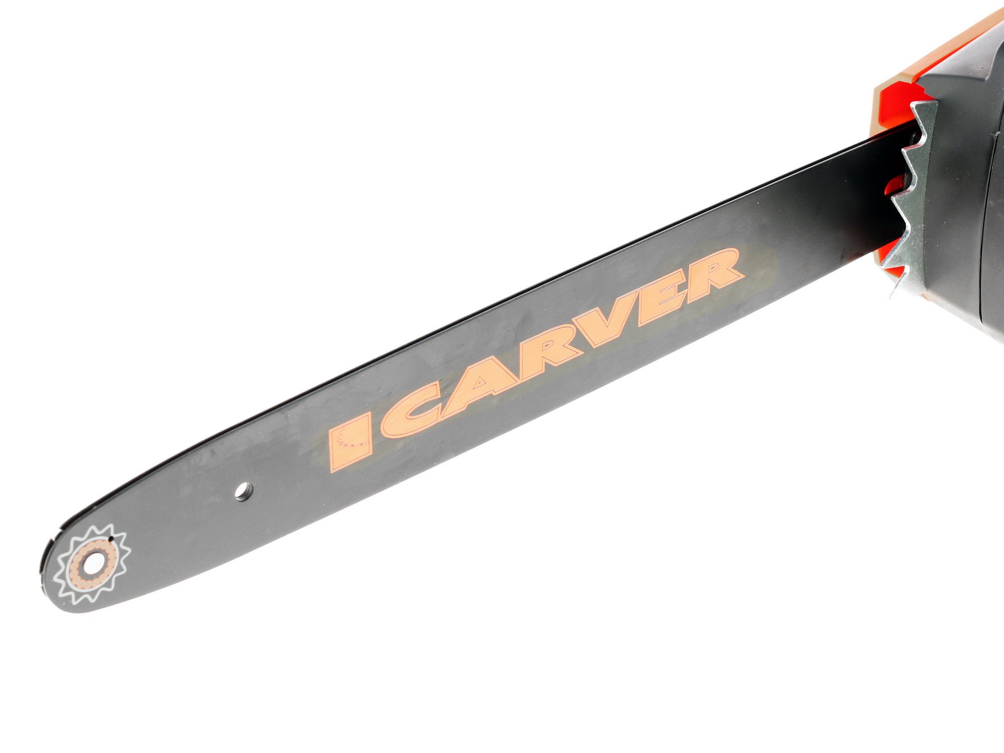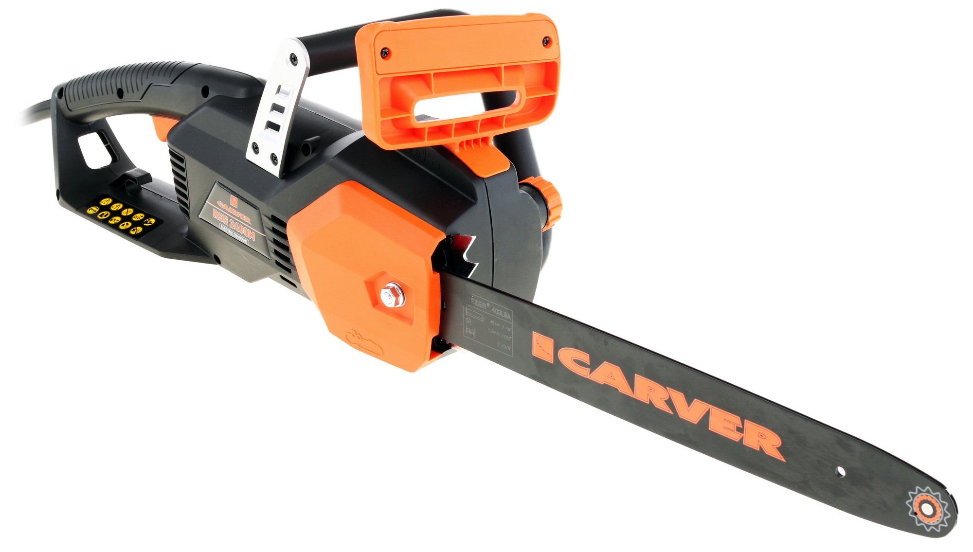 CARVER RSE- 2400М делает до 7600 оборотов цепи в минуту. Инструмент является очень безопасным. Случайное включение исключено, так как установлена специальная блокировка пусковой кнопки. Кроме того, устройство оснащено цепным тормозом. В случае необходимости его можно остановить практически моментально.