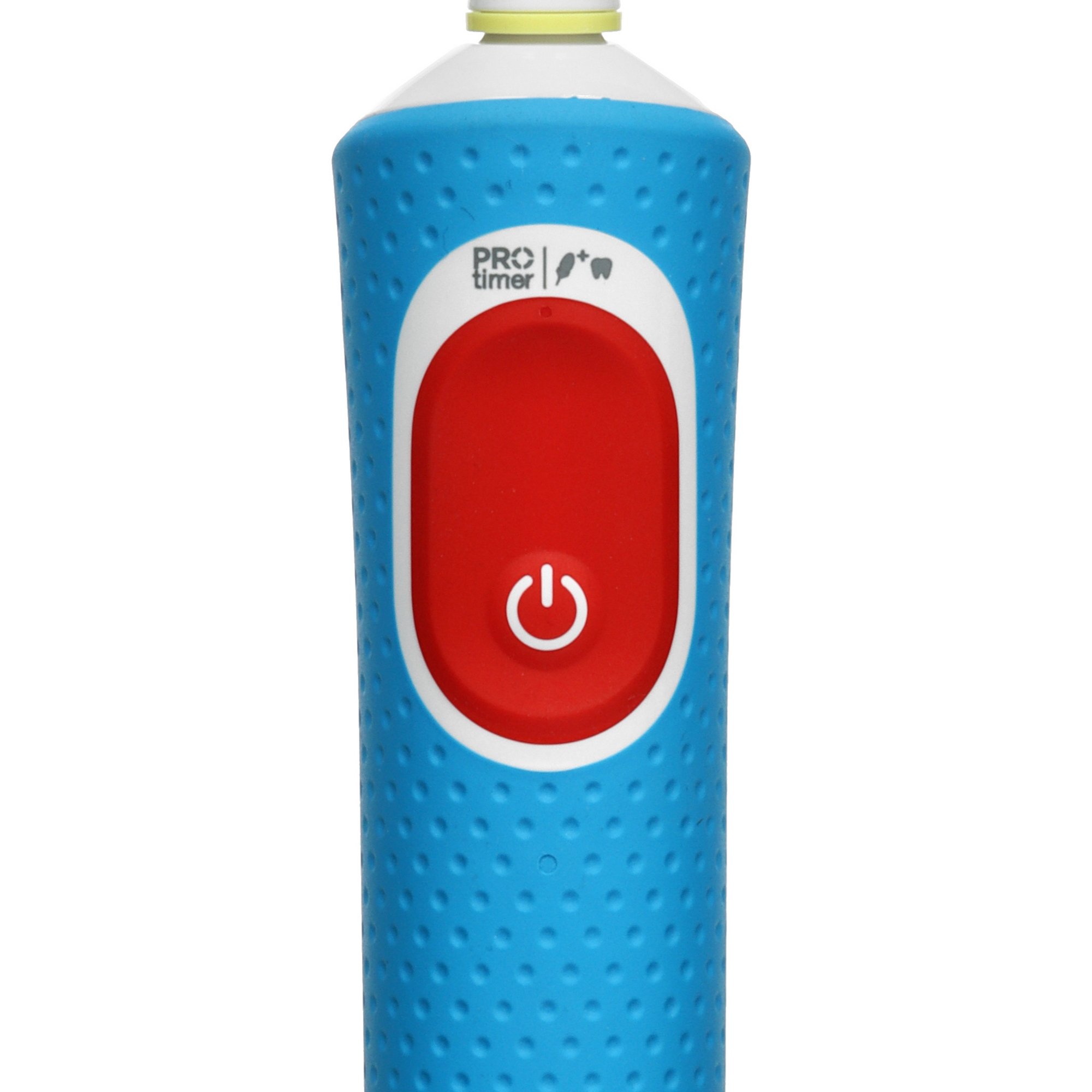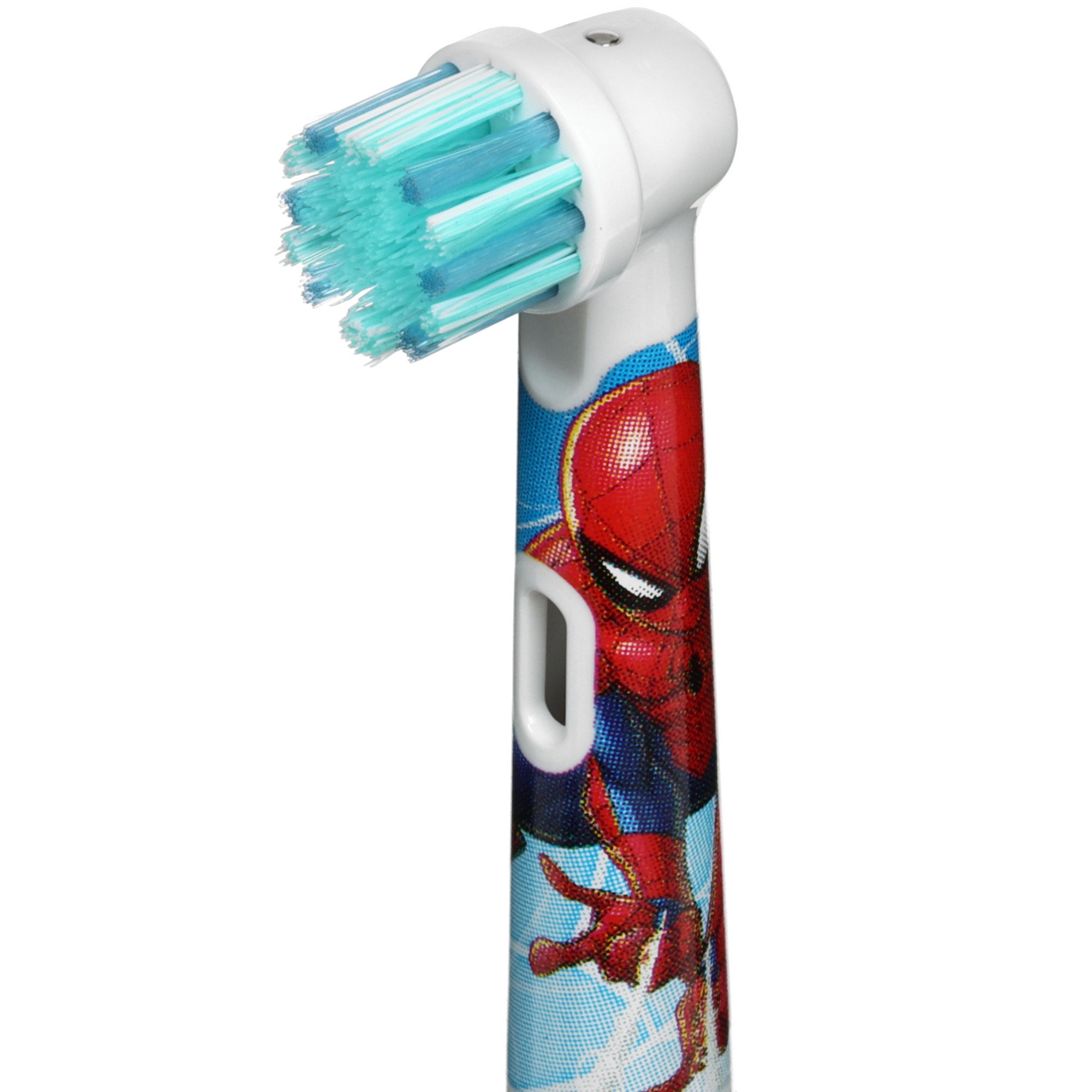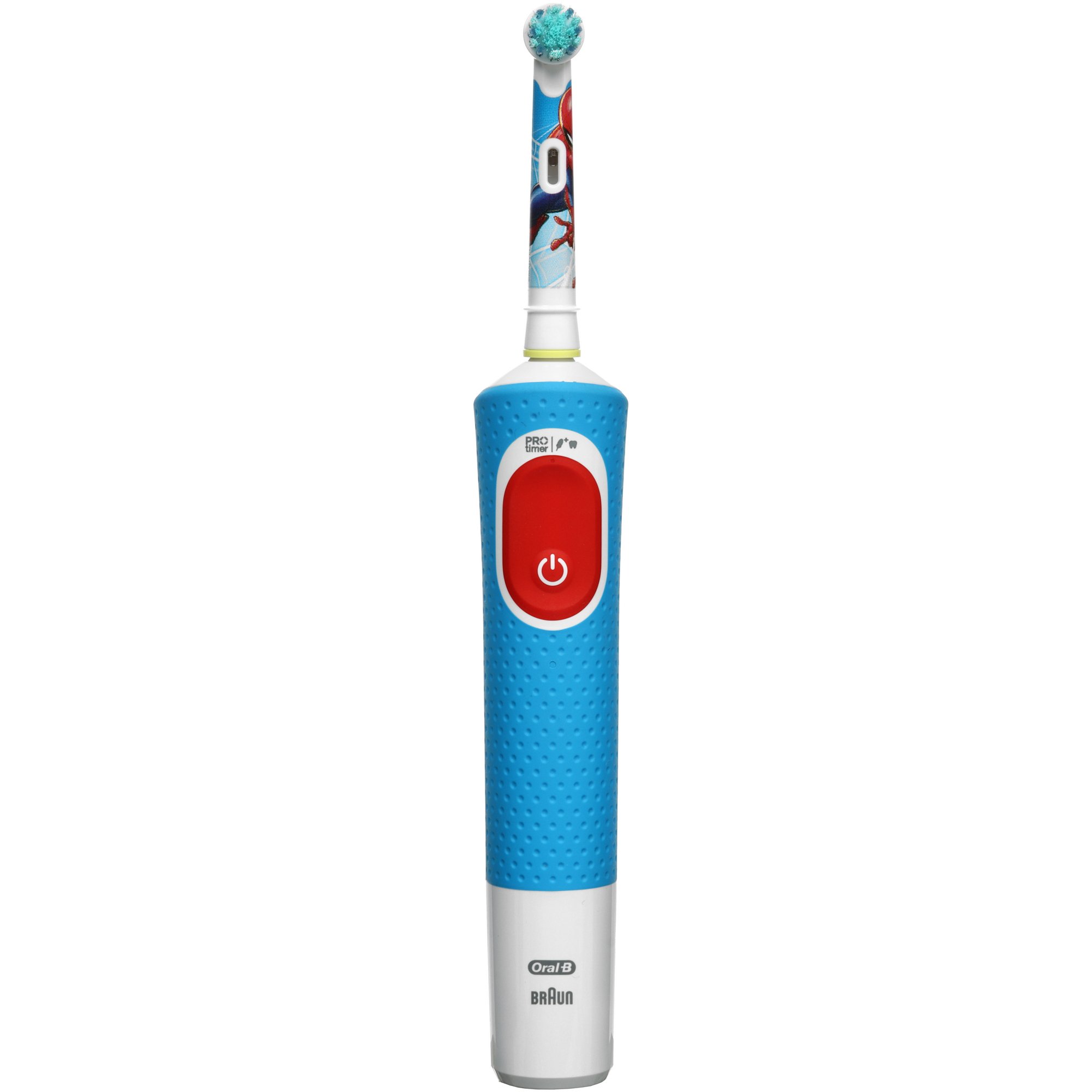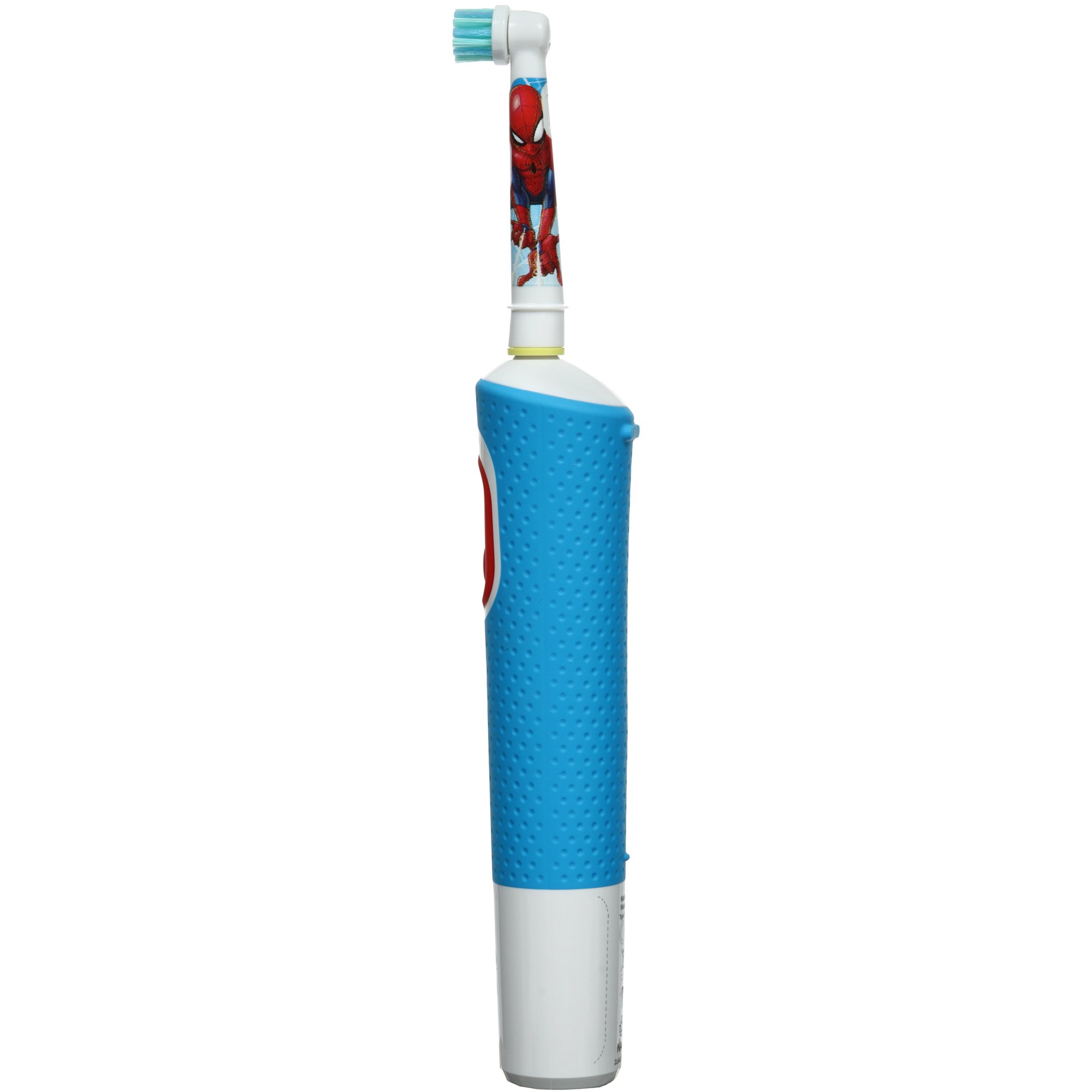 Головка Braun Oral-B Vitality Pro D103 Kids Spiderman совершает 7600 об/мин, устраняя мельчайшие частицы пищи из межзубного пространства и труднодоступных участков. На щетинки нанесена краска, которая утрачивает яркость по мере износа насадки. Кнопка включения находится посередине голубого пластикового корпуса. Звуковой сигнал информирует о необходимости сменить область очистки.
