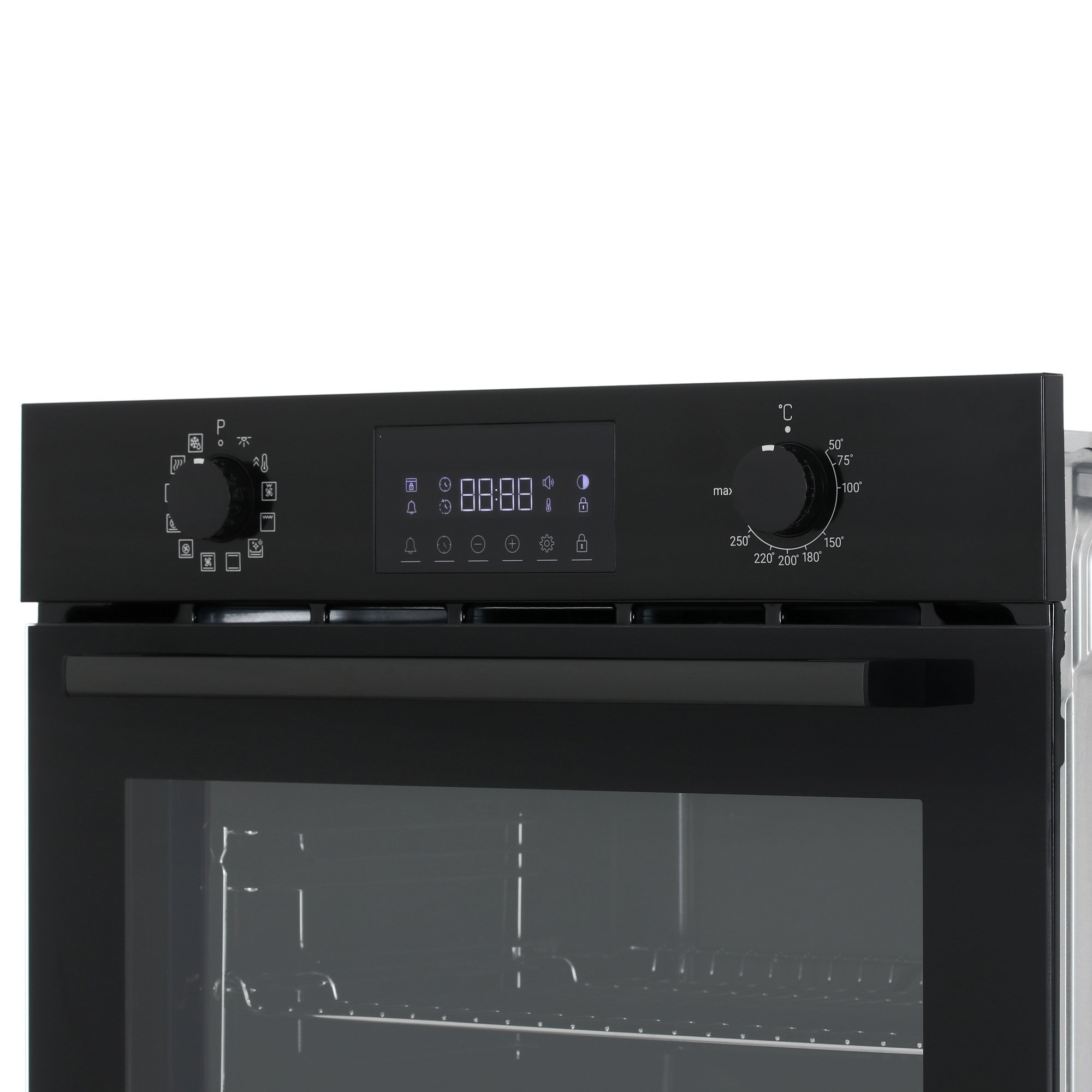Панель управления представлена утапливаемыми поворотными переключателями, сенсорными кнопками и дисплеем. Функция блокировки исключает изменение заданных параметров. Таймер с автоотключением программирует нужное время работы духового шкафа Indesit IBFTE 3844 J BL и останавливает нагрев по его завершению. Внутренние стенки с покрытием из каталитической эмали расщепляют жир и загрязнения под действием нагрева или пара.