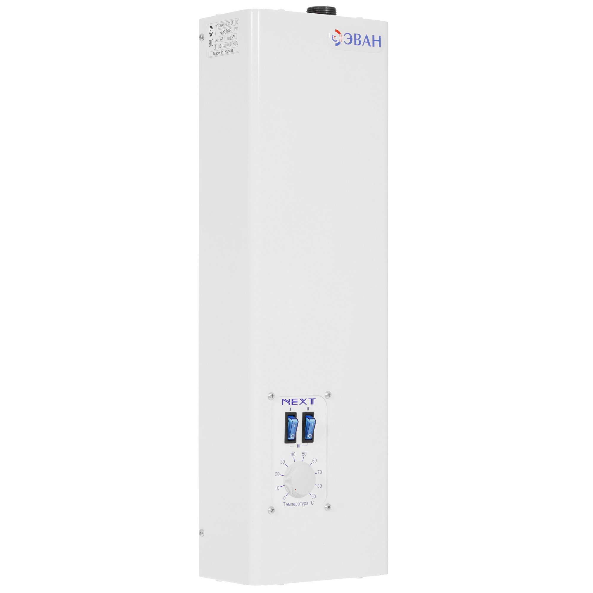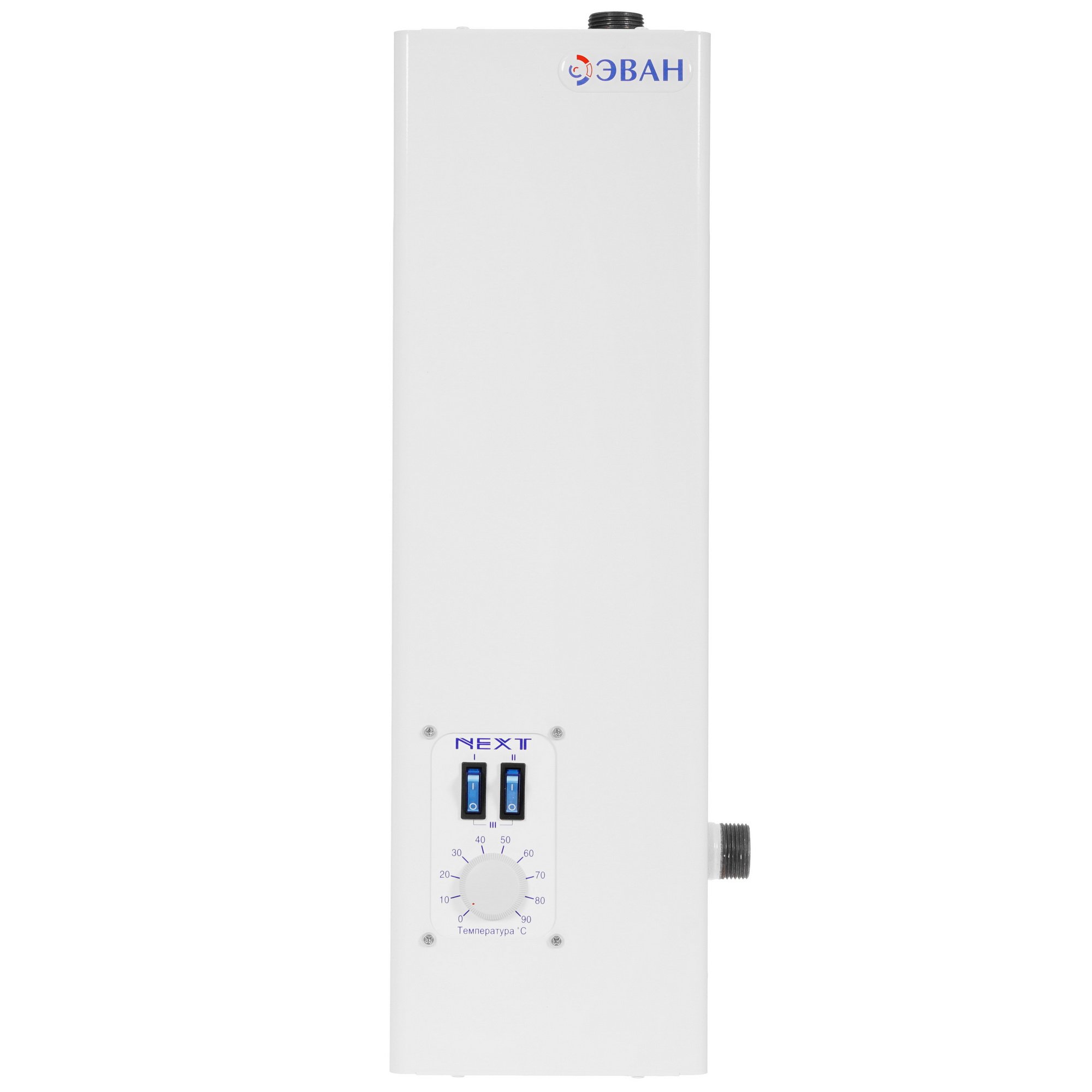 Электрокотел для отопительной системы Эван NEXT- 3 в белом корпусе из стали имеет понятное, полностью аналоговое управление с двумя тумблерами и переключателем для выбора температуры теплоносителя. Эта компактная модель весом всего 5 кг рассчитана на настенную установку.