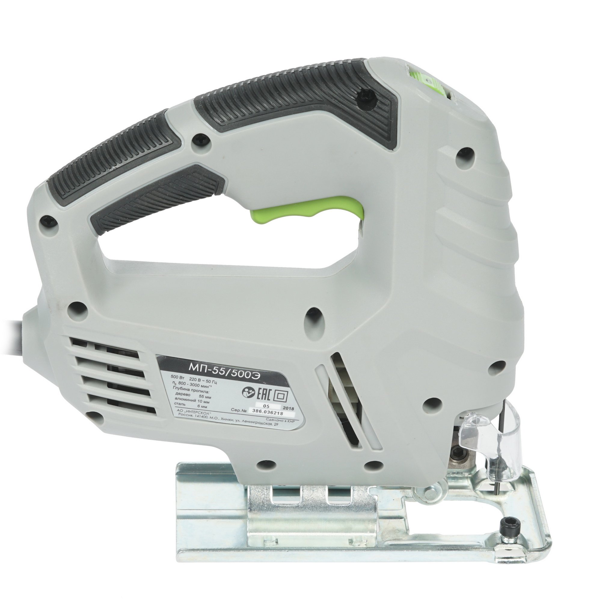 Интерскол МП-55/500Э оснащен 18 мм ходом, который пропилит дерево на глубину 55 мм, изделие из цветного металла на 10 мм и более твердый металл на 6 мм, при этом, не возникнет вибрация. Для удобства встроена подсветка рабочей зоны, регулировка наклона подошвы на угол до 45°, возможность подключения к пылесосу. А также, если при работе накопилось много стружек и пыли, что мешает дальнейшим действиям, их всегда можно сдуть встроенным вентилятором.