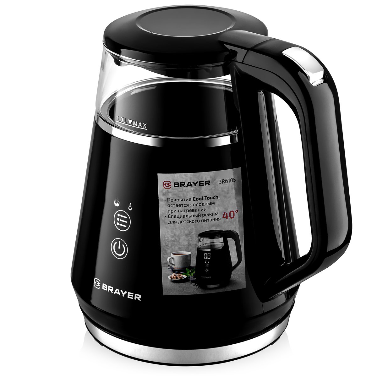 Максимальная мощность чайника Brayer BR6105 - 1100 Вт. Корпус из высокопрочного термостойкого стекла с пластиковым покрытием Cool Touch, которое остается холодным при нагревании. Функции кипячения и подогрева воды для разных сортов чая (40-100° С). Поддержание заданной температуры в течение 2-х часов