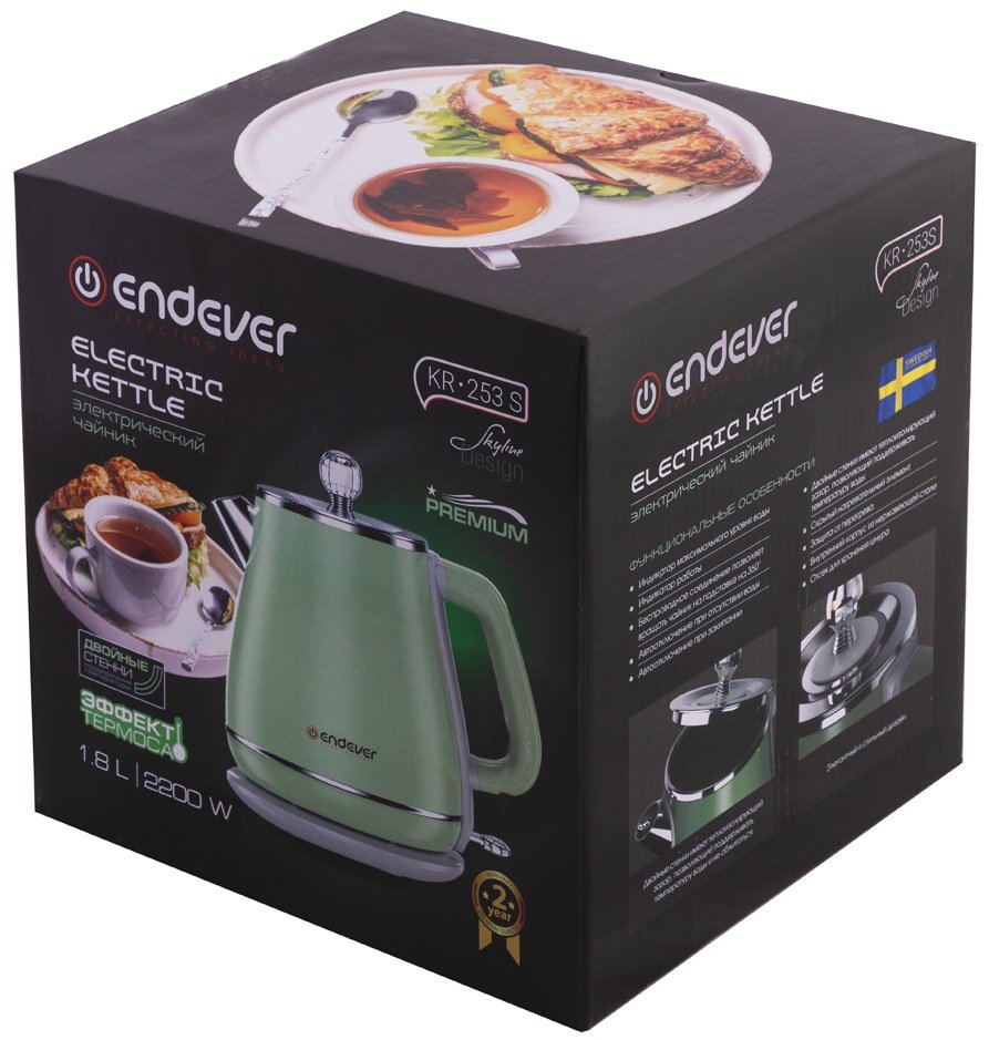 Уникальный дизайн электрического чайника Endever Skyline KR-253S позволит ему занять достойное место на кухне. Высокая мощность устройства 2200 Вт дает возможность быстро и качественно вскипятить большой объем воды за 5 минут, рассчитанный на 1,8 литров. В данной модели чайника применена технология двойного корпуса. Внешний корпус сделан из экологичного и термостойкого пластика. Внутренний корпус выполнен из высококачественной нержавеющей стали 304, которая послужит гарантом долговечности и безопасности использования и сохранит оригинальный вкус вскипяченной воды (без посторонних запахов и привкуса). Дополнительными функциональными особенностями модели являются двойные стенки с теплоизолирующим зазором, благодаря чему, чайник может сохранять тепло до 4 часов. Безупречно спроектированная съемная крышка способствует максимально удобному наполнению чайника водой. Специальная форма носика позволяет наливать воду в чашку без расплескивания и брызг. Часть кабеля питания, которая не используется, укладывается в нижнюю часть основания, что обеспечивает аккуратный внешний вид как при использовании, так и при хранении.